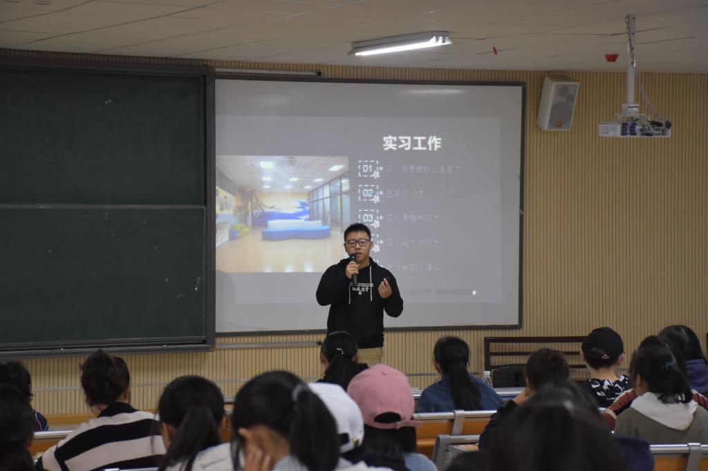 孙思博从实习前准备、具体实习地方、实习需要做的工作、在实习过程中能学到的东西以及个人收获等五个方面来展开分享。首先,就实习前的准备而言,建议同学们平时注意自我能力的培养和专业素质的提升。接着,给同学们分享了在实习学校中的主要工作包括:给学生上心理健康课堂、学生心理咨询、班主任工作及相关德育工作等。同时,也分享了自己在实习过程中遇到的一些问题及解决策略,他谈到,在实习的这个过程中,对中小学心理健康工作有了更深刻的理解,对“理论与实践”的关系也有了一个较为清晰的区分。最后,孙思博建议同学们在大学的学习生活中,要不断挖掘自己的长处,并争取锻炼成长的机会。同时,也要善于接纳自己的短处,勇于尝试,不断挑战自己并总结反思,获得自我提升。