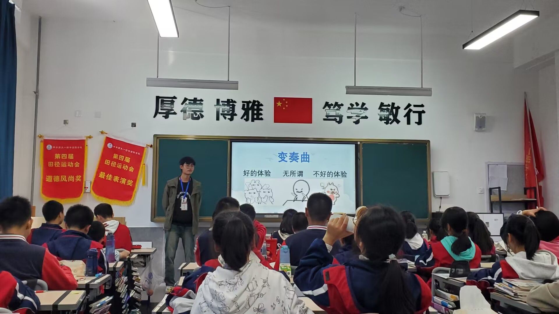 张月同学在八年级(3)班上了一堂主题为《你好!消极君》的课。是一堂关于如何看待自己在生活中遇到的消极事件的课,主要目的是让学生懂得如何在消极事件里面看到其积极的一面,有助于学生转换角度对待消极,从而取得进步。