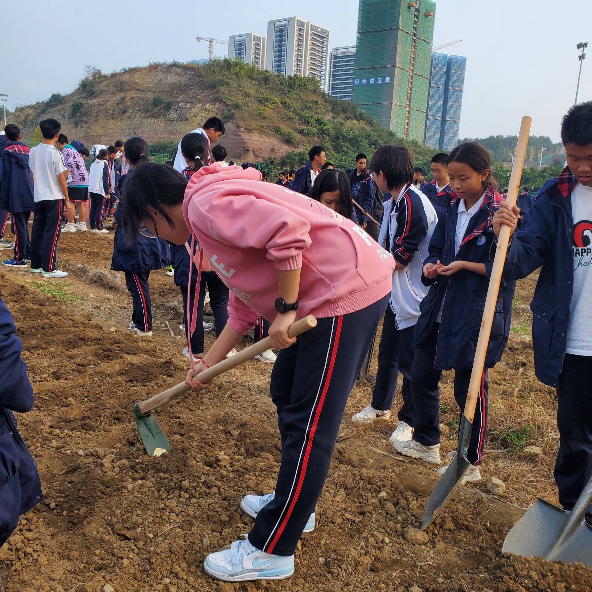 学校每周五下午最后一节开设了一堂《劳动与技术教育》的课,主要内容是在各班分管的土地上种农作物,这个学期种的是豌豆,这个星期的内容是松土,挖坑与播种。老师与学生都亲自下地劳作,体验播种的过程,亲自拿起锄头挖坑,播撒种子,浇水,不仅有利于学生体会到农作物的播种过程,提高学生之间的团结性,使其全面发展,也缩短了学生与老师之间的距离。