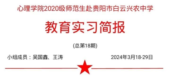 教育对师范生而言,是一个深入了解学生、探索教育理念的过程。通过实习,我们有机会与不同背景、不同需求的学生互动,理解他们的思想、情感和学习方式,从而提高我们的教育能力和敏锐度。这也是一个审视自我、不断反思和成长的过程,促使我们更深刻地思考教育的意义和方法。贵州师范大学心理学院2020级师范生在贵阳市白云兴农中学第三、四周教育实习工作稳步进行。