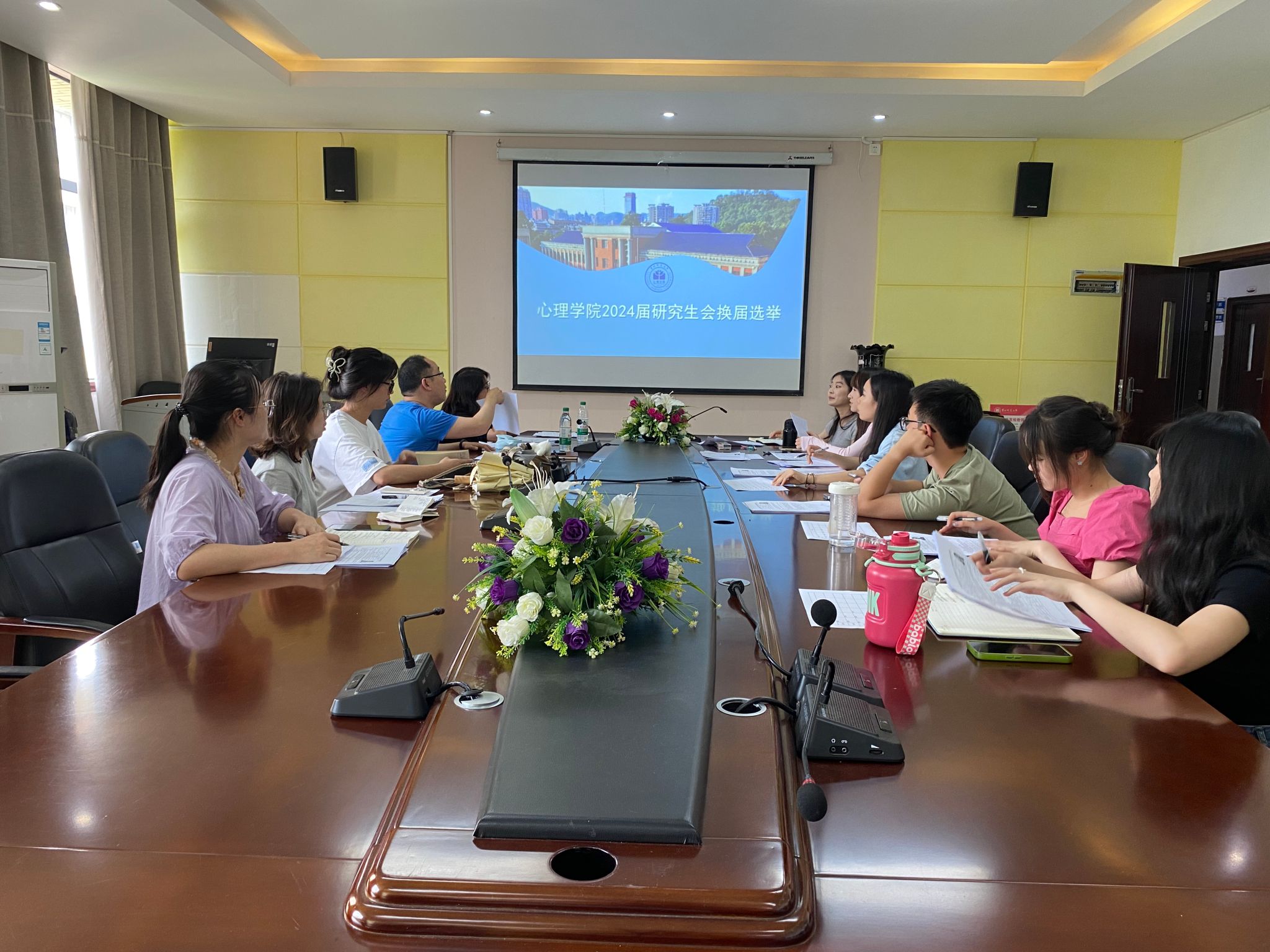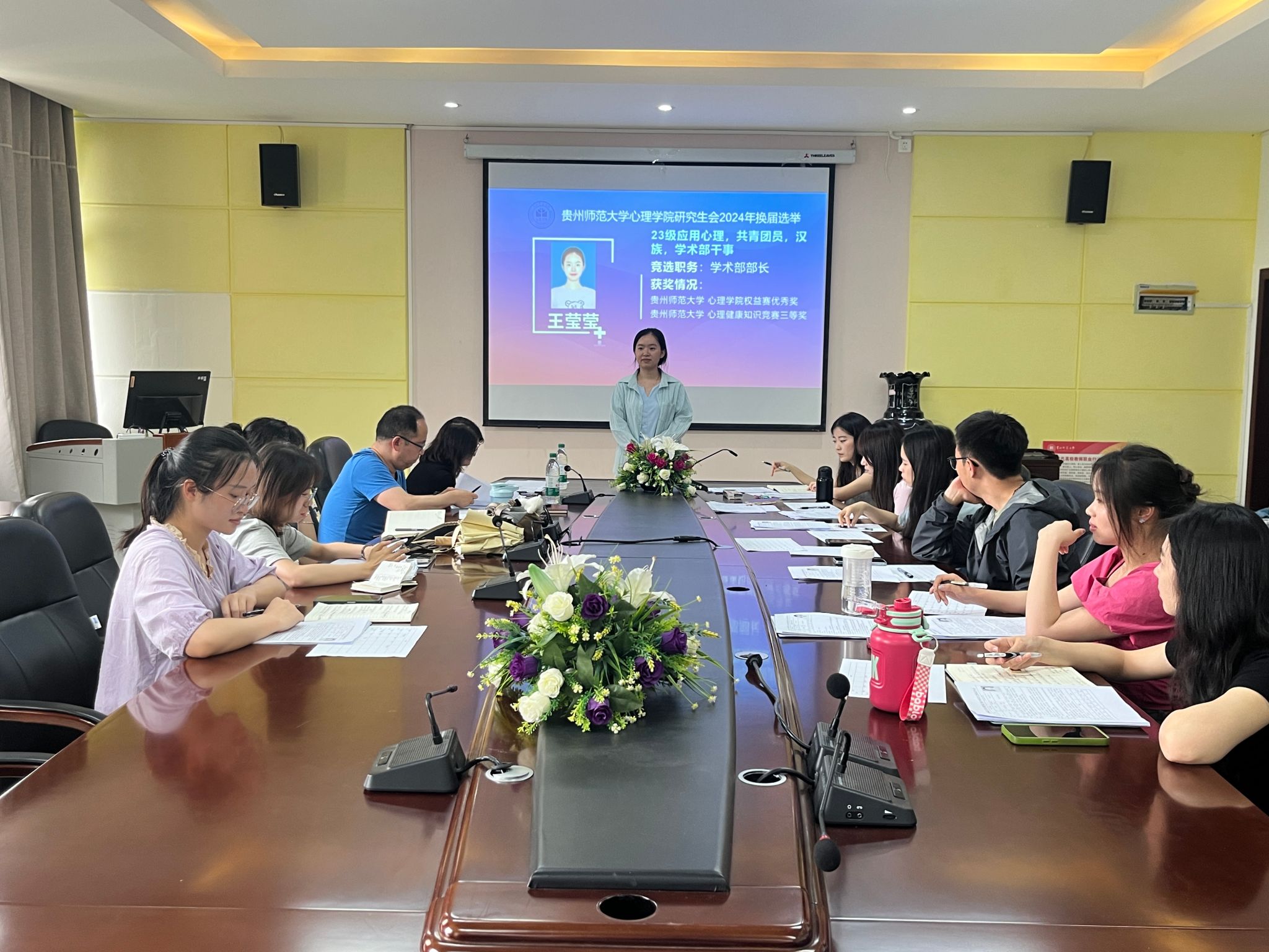 为了增强心理学院研究生会的凝聚力和创新力,保持研究生会的稳定性和民主性,心理学院研究生会于2024年6月20日上午,在心理学院教学楼2302会议室召开换届会议。研究生科科长裴子钊老师、周瑗老师,研究生会主席团、各部门部长和参与换届竞选的十四位研究生会成员参加,会议由学院现任研究生会主席周馨悦主持。