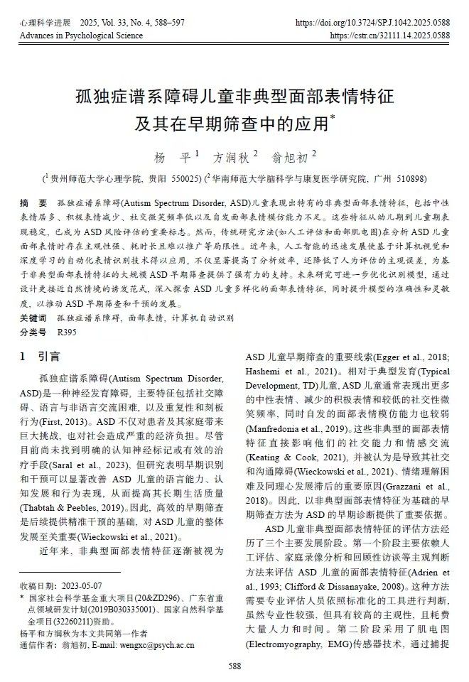 3. 杨平副教授作为第一作者,2025年3月在CSSCI期刊《心理科学进展》上发表了题为“孤独症谱系障碍儿童非典型面部表情特征及其在早期筛查中的应用”的研究论文。研究围绕ASD儿童的非典型面部表情特征进行了系统回顾。