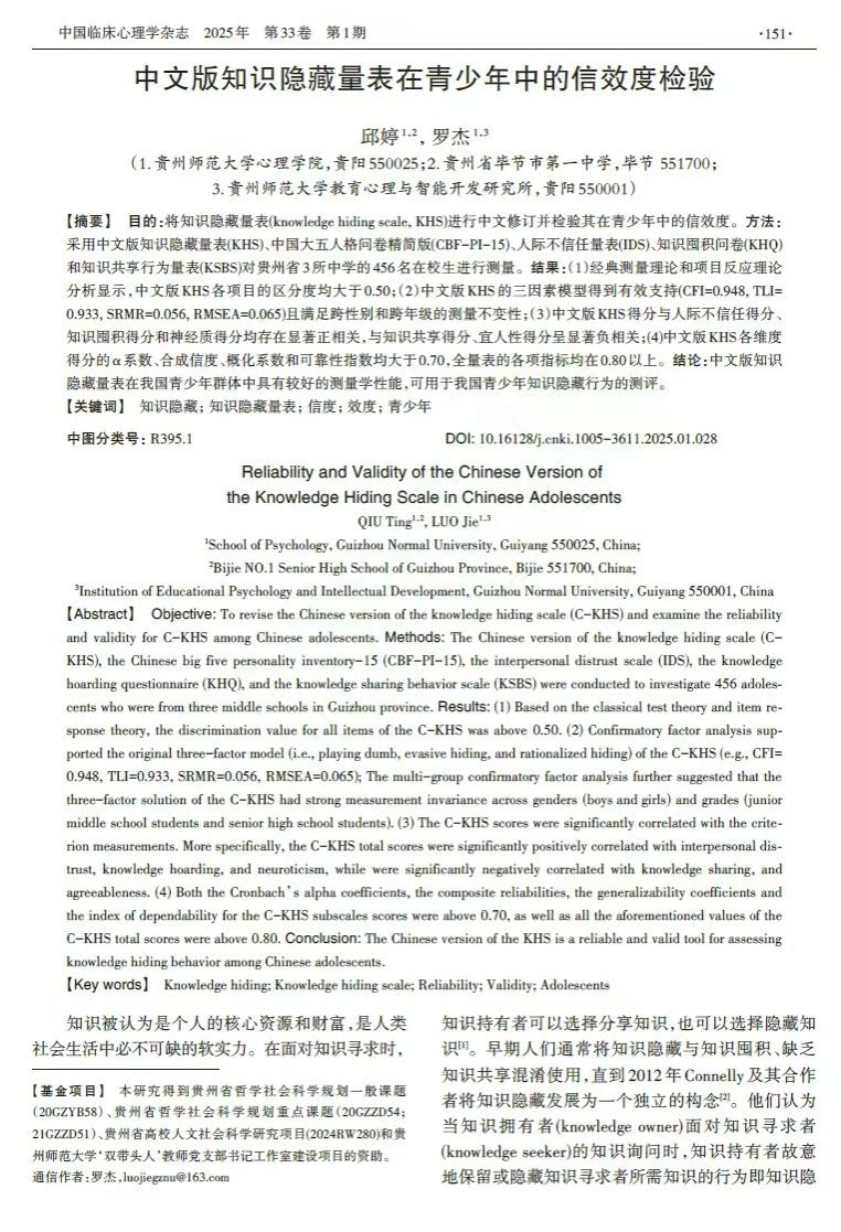 5. 研究生邱婷作为第一作者,罗杰教授作为通讯作者,2025年2月在CSSCI期刊《中国临床心理学杂志》上发表了题为“中文版知识隐藏量表在青少年中的信效度检验”的研究论文。研究发现,中文版知识隐藏量表在我国青少年群体中具有较好的测量学性能,可用于我国青少年知识隐藏行为的测评。