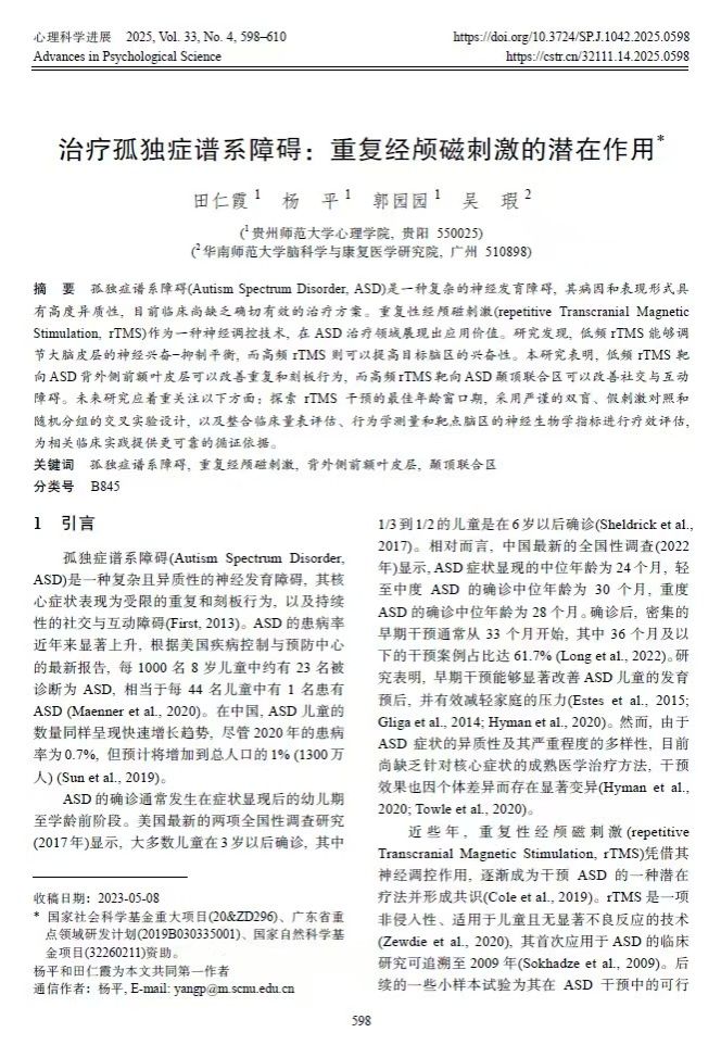 4. 研究生田仁霞作为第一作者,杨平副教授作为通讯作者,2025年3月在CSSCI期刊《心理科学进展》上发表了题为“治疗孤独症谱系障碍:重复经颅磁刺激的潜在作用”的研究论文。研究发现,低频rTMS靶向ASD背外侧前额叶皮层可以改善重复和刻板行为,而高频rTMS靶向ASD颞顶联合区可以改善社交与互动障碍。