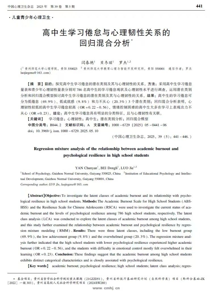 2. 研究生闫春艳作为第一作者,罗杰教授作为通讯作者,2025年4月在北大核心期刊《中国心理卫生杂志》上发表了题为“高中生学习倦怠与心理韧性关系的回归混合分析”的研究论文。研究发现,高中生学习倦怠具有明显的分类特征,且与心理韧性有关联。