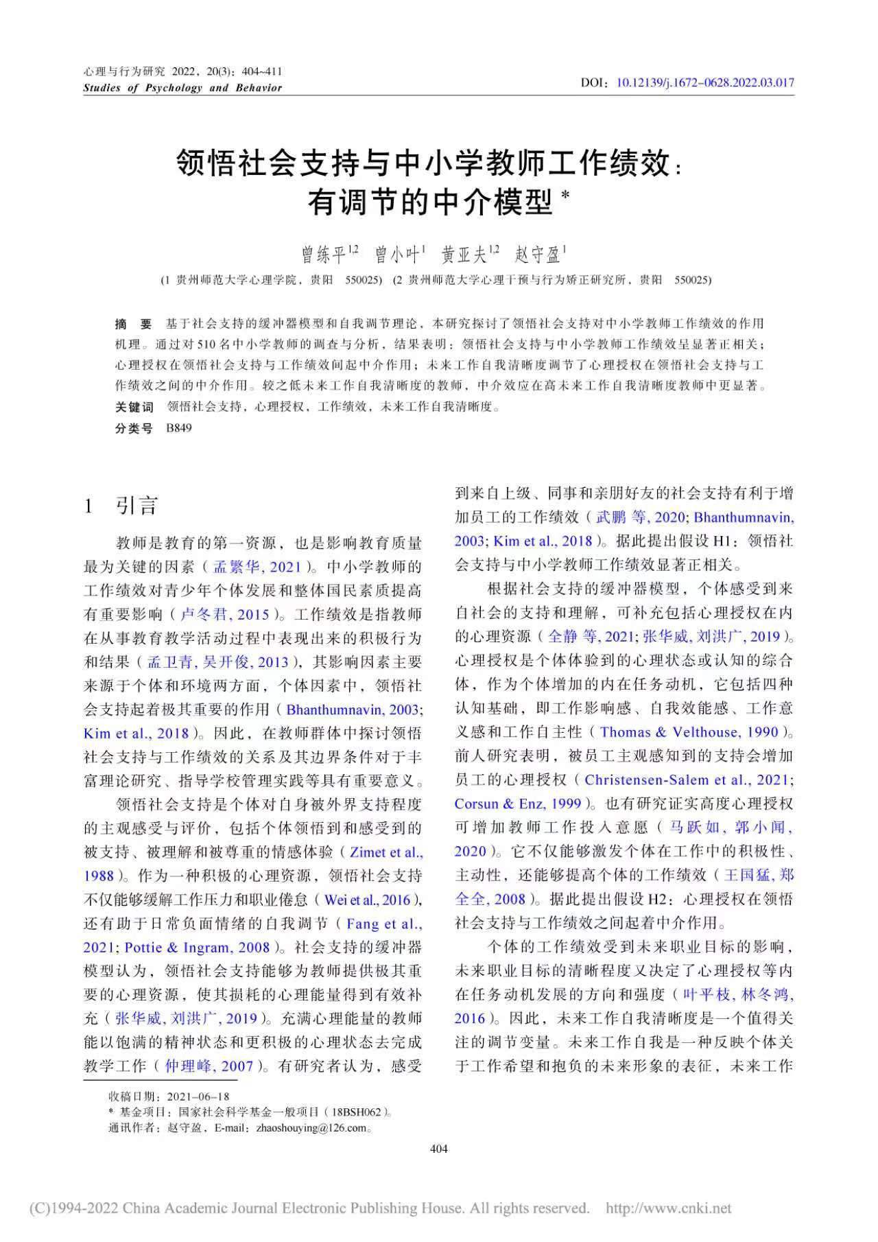 6.曾练平教授作为第一作者,2022年5月在CSSCI期刊《心理行为研究》发表了题为“领悟社会支持与中小学教师工作绩效:有调节的中介模型”的学术论文。基于社会支持的缓冲器模型和自我调节理论,本研究探讨了领悟社会支持对中小学教师工作绩效的作用机理。
