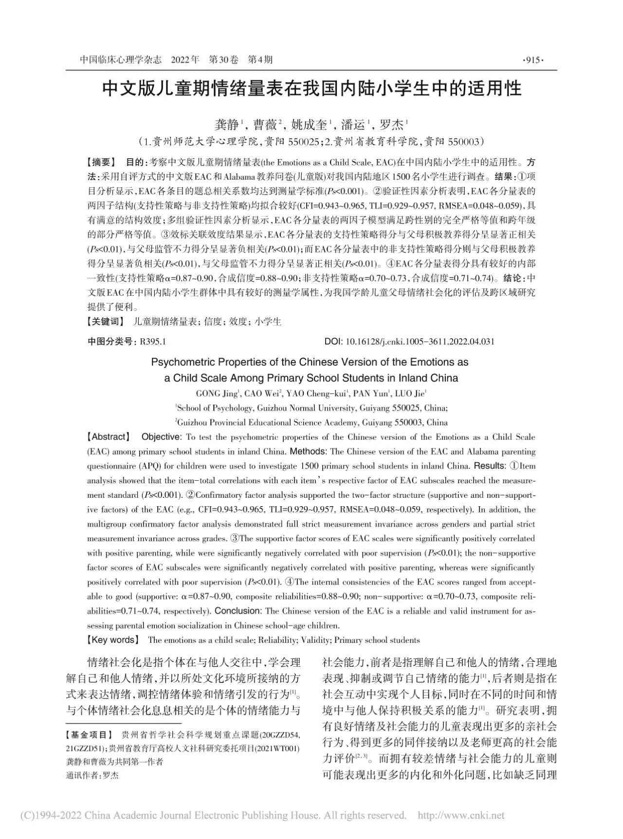 8.硕士研究生龚静作为第一作者,罗杰教授作为通讯作者,2022年8月在CSSCI期刊《中国临床心理学杂志》发表了题为“中文版儿童期情绪量表在我国内陆小学生中的适应性”的学术论文。
