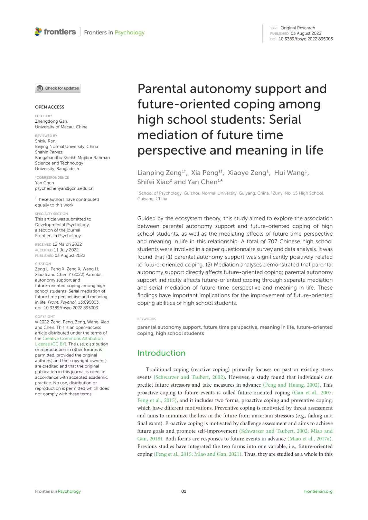 2.曾练平教授作为第一作者,陈衍副教授作为通讯作者,2022年8月在SSCI JCR一区期刊《Frontiers in Psychology》发表了题为“Parental autonomy support and future-oriented coping among high school students”的学术论文。本研究以生态系统理论为基础,旨在探讨父母自主支持与高中生未来取向应对之间的关系,以及未来时间洞察力和生活意义在二者关系中的链式中介作用。