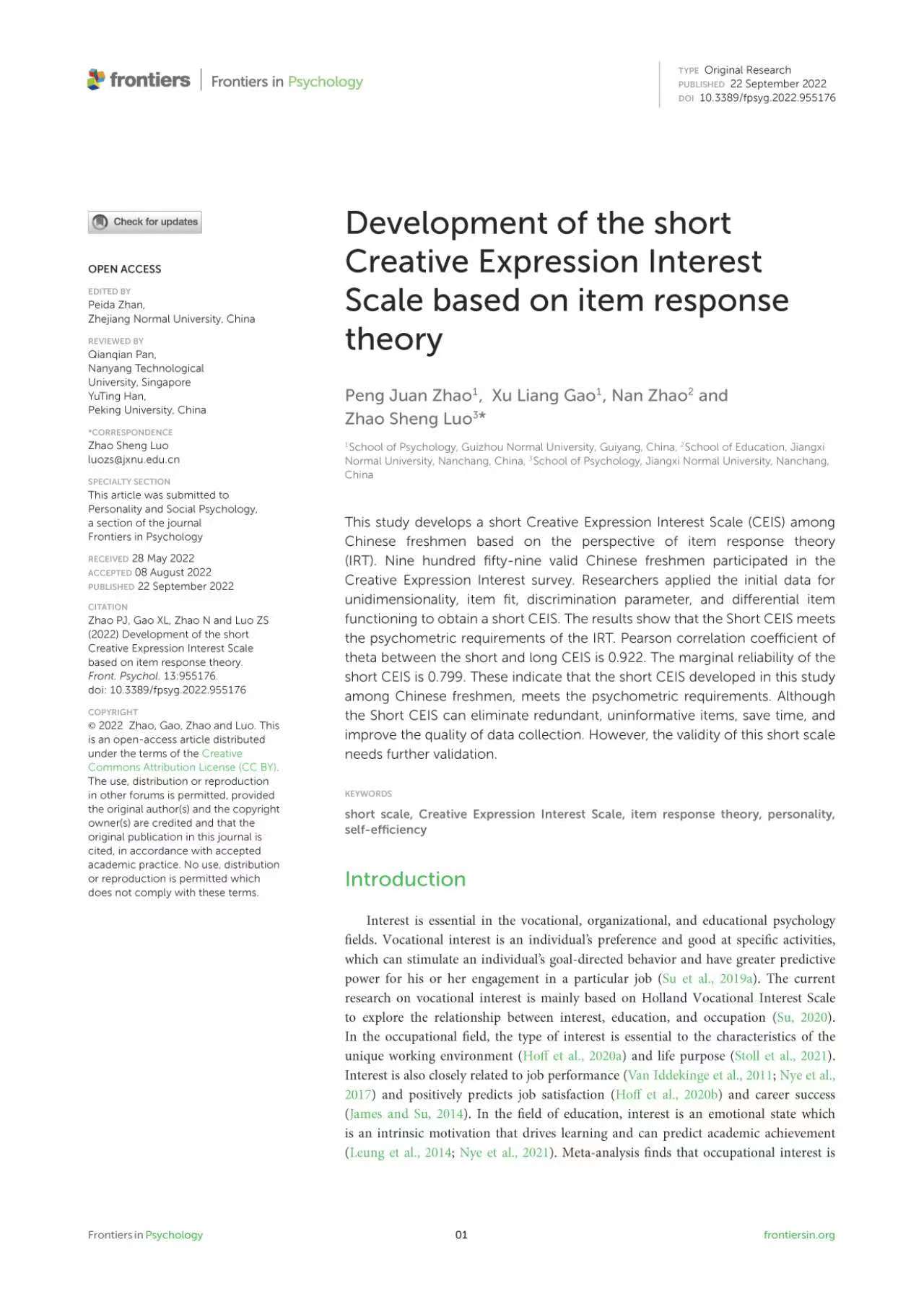 4.赵鹏娟老师作为第一作者,2022年9月在SSCI JCR一区期刊《Frontiers in Psychology》发表了题为“Development of the short Creative Expression Interest Scale based on item response theory”的学术论文。本研究基于项目反应理论(IRT),应用单维度、项目匹配、辨别参数和差异项目功能编制了一份中国新生创造性表达兴趣量表(CEIS),并检验了该量表在中国新生中的信效度。