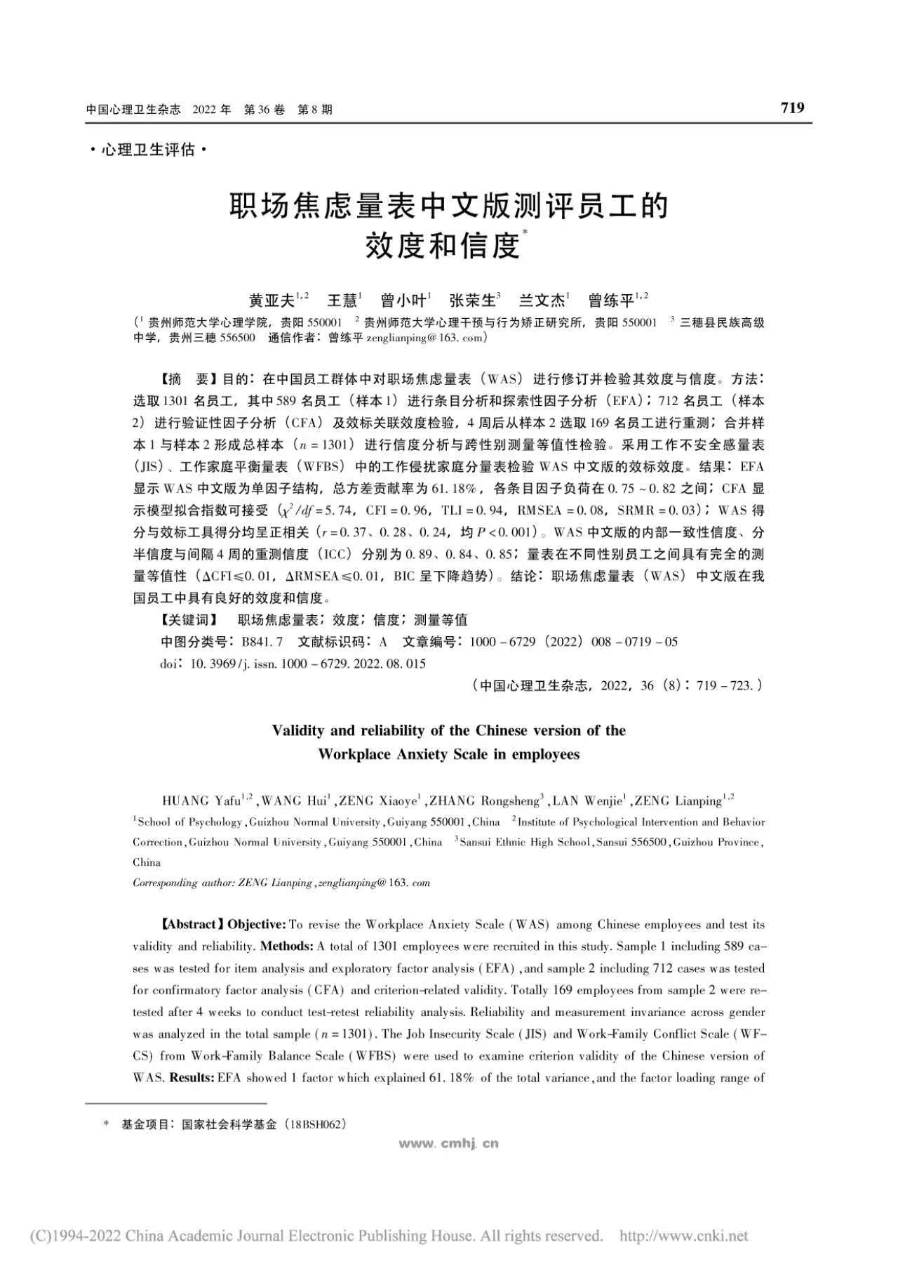 9.黄亚夫副教授作为第一作者,曾练平教授作为通讯作者,2022年7月在CSCD期刊《中国心理卫生杂志》发表了题为“职场焦虑量表中文版测评员工的效度和信度”的学术论文。该论文检验修订了职场焦虑量表中文版,并检验其在我国员工群体中的信效度。