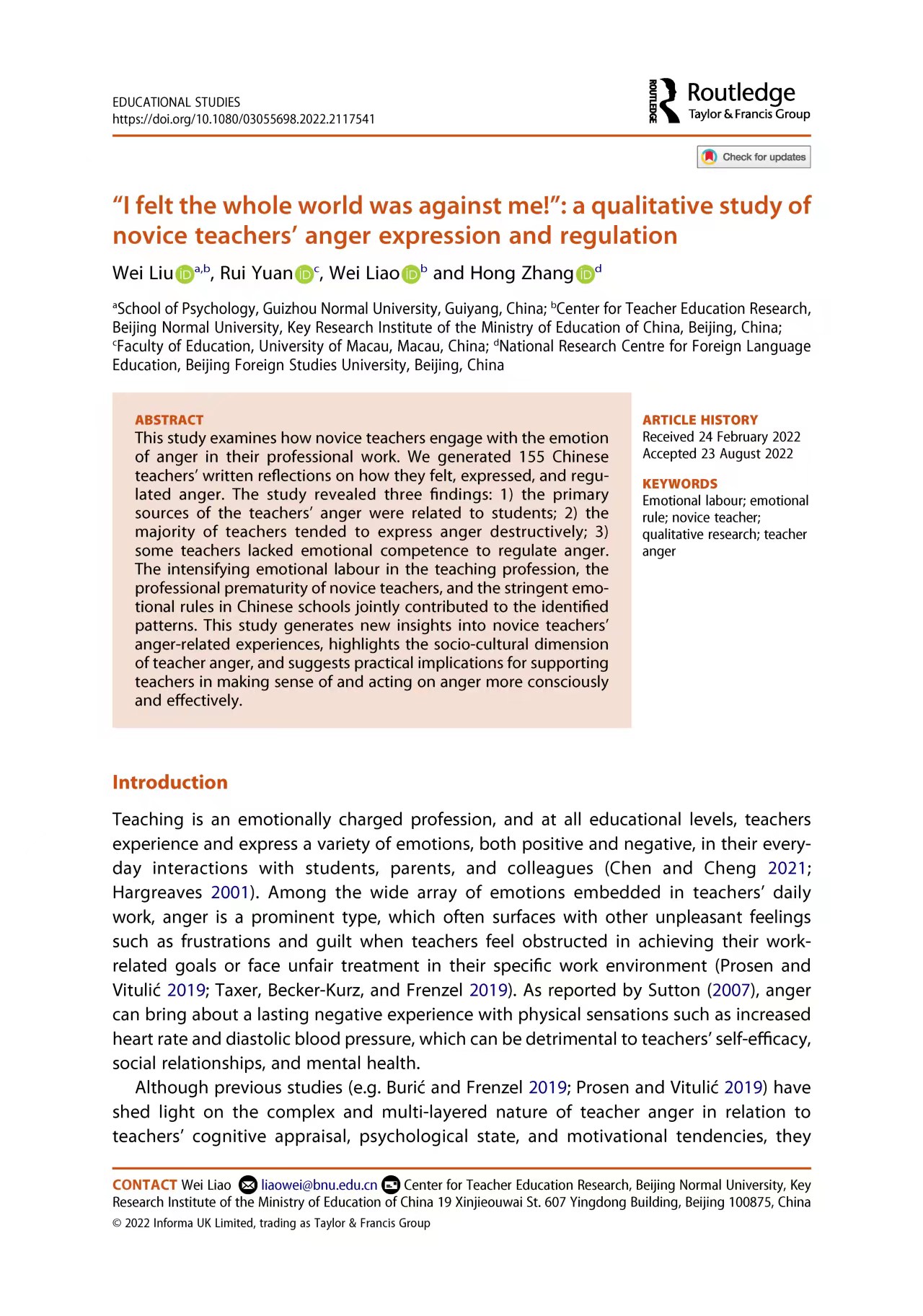 5.刘伟老师作为第一作者,2022年9月在SCI JCR四区《Educational Studies》发表了题为“I felt the whole world was against me!: a qualitative study of novice teachers’ anger expression and regulation”的学术论文。本研究研究调查了新手教师在专业工作中如何处理愤怒情绪。研究强调了新手教师愤怒的社会文化层面原因,并为教师更有意识、更有效地理解和应对愤怒提出了实际建议。