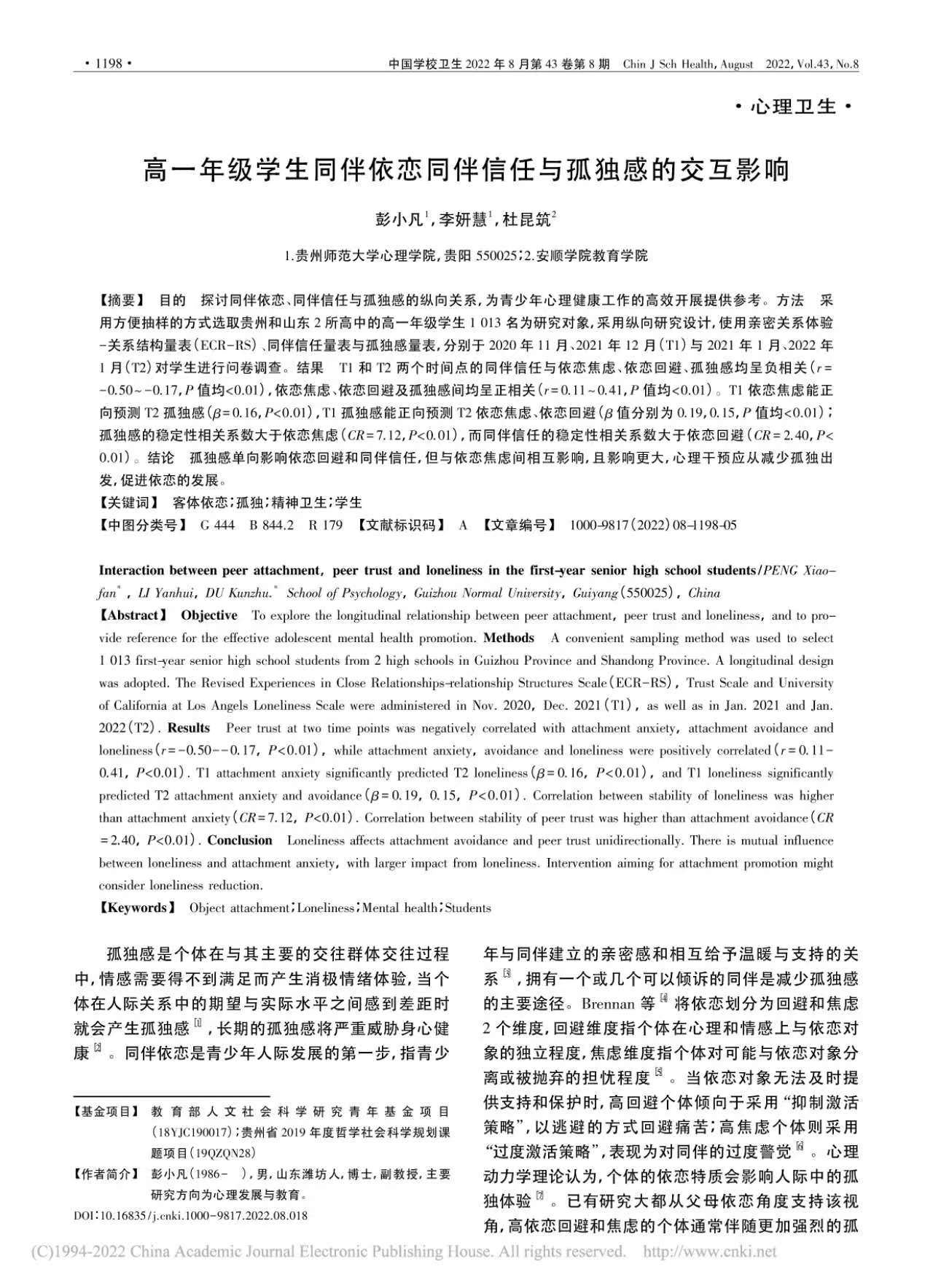10.彭小凡副教授作为第一作者,2022年8月在北大核心期刊《中国学校卫生》发表了题为“高一年级学生同伴依恋同伴信任与孤独感的交互影响”的学术论文。研发现孤独感与同伴依恋间相互影响,且孤独感对同伴依恋的影响更大,心理干预应从减少孤独出发,促进依恋的发展。