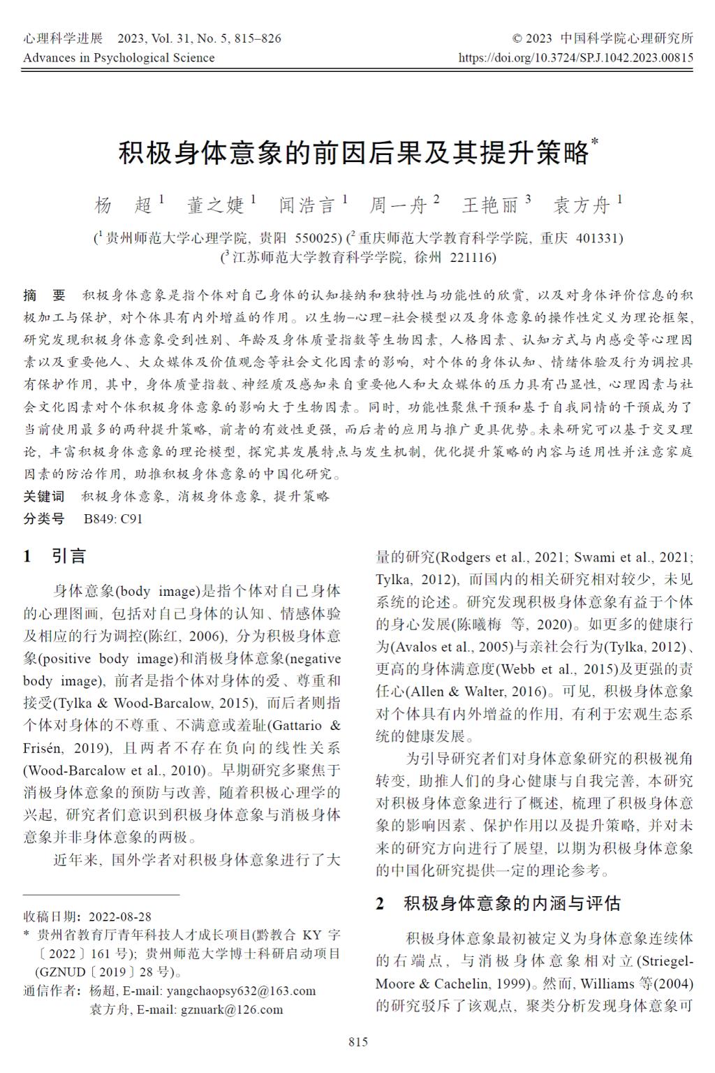 6.杨超副教授作为第一作者和通讯作者,袁方舟副教授作为通讯作者,2023年2月在CSSCI期刊《心理科学进展》发表了题为“积极身体意象的前因后果及其提升策略”的学术论文。研究对积极身体意象相关文献进行了全面系统的分析和总结。