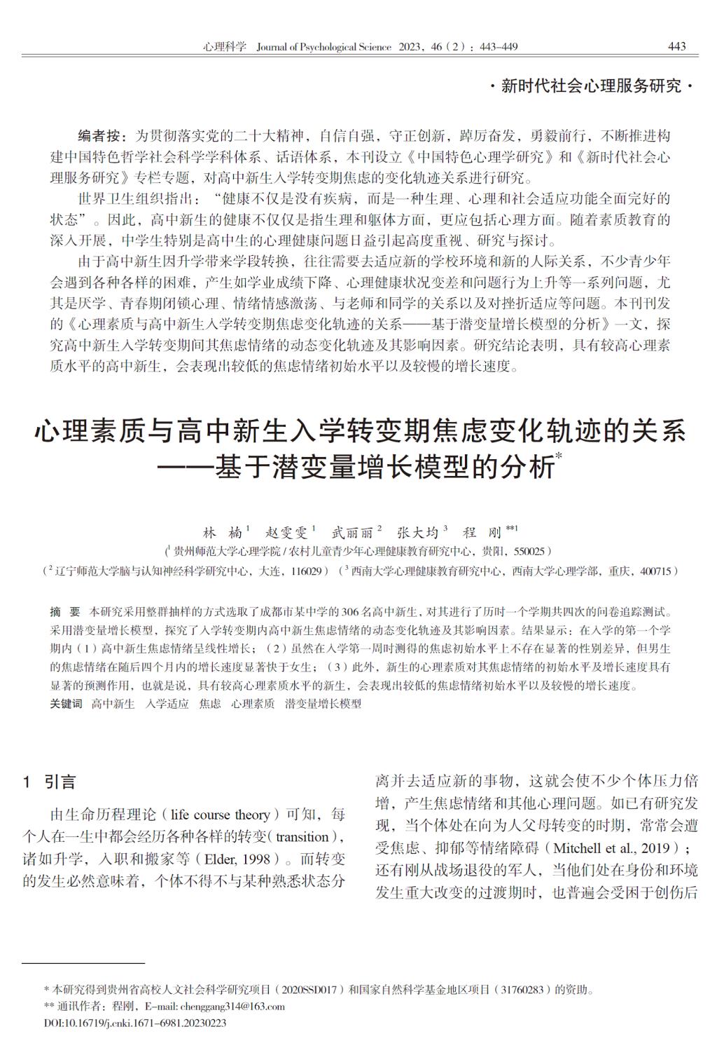 5.研究生林楠作为第一作者,程刚教授作为通讯作者,2023年3月在CSSCI期刊《心理科学》发表了题为“心理素质与高中新生入学转变期焦虑变化轨迹的关系——基于潜变量增长模型的分析”的学术论文。研究揭示了入学转变期内高中新生焦虑情绪的动态变化轨迹及其影响因素。