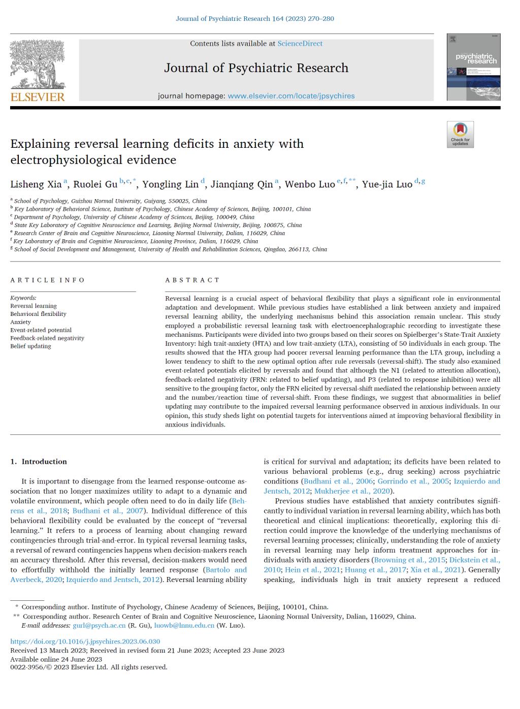 1.夏礼胜副教授作为第一作者,2023年6月在SCI JCR二区期刊《Journal of Psychiatric Research》发表了题为“Explaining reversal learning deficits in anxiety with electrophysiological evidence”的学术论文。研究采用概率性逆转学习任务和事件相关电位技术,探究了焦虑和逆转学习能力受损之间的联系,及这种联系背后的电生理学机制。