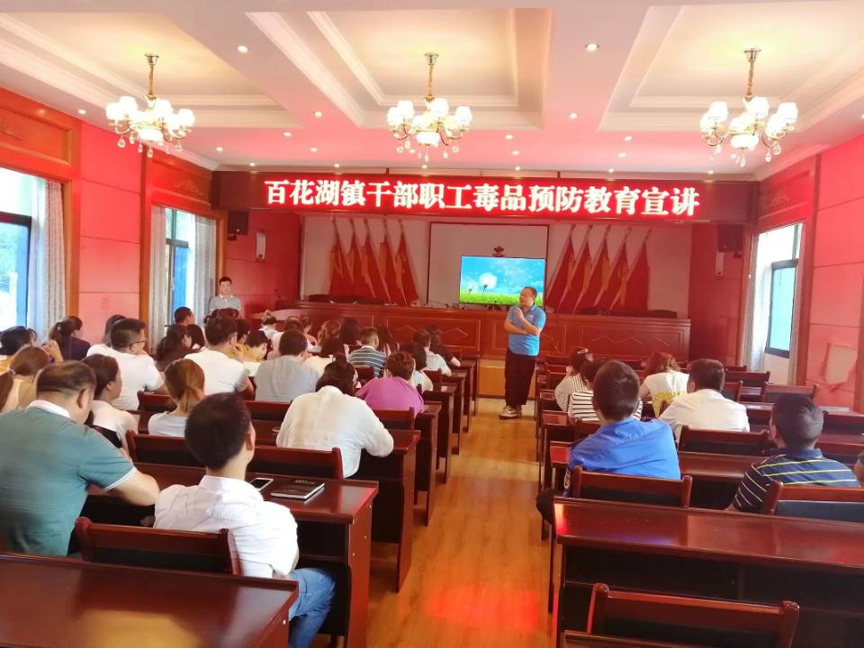 第一小分队由心理学院“三下乡”志愿服务队领队郑传章带队,于百花湖人民政府会议室为百花湖镇人民政府部分干部职工开展了“百花湖镇干部职工毒品预防教育宣讲”,参会人员计六十余人。讲座以干部职工喜闻乐见的形式展开,让公职人员深刻了解了党和政府的禁毒决心,增强了他们禁毒意识。在做到以身作则的同时,加大向周围的群众宣传禁毒知识的力度。