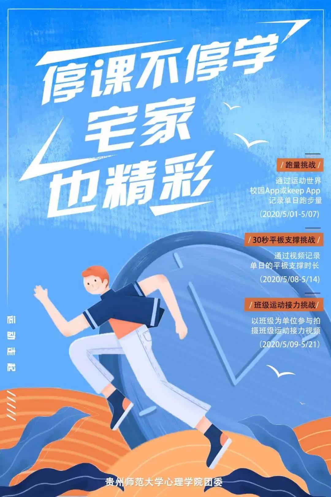 因长期的线上学习,大部分同学长期宅在家中,缺乏体育锻炼。为丰富广大青年学生的居家生活,引导大家加强体育锻炼、强健体魄,心理学院组织开展“停课不停学,宅家也精彩”主题健身活动。活动时间为5月1日至5月21日。活动对象为2017级、2018级、2019级本科生。