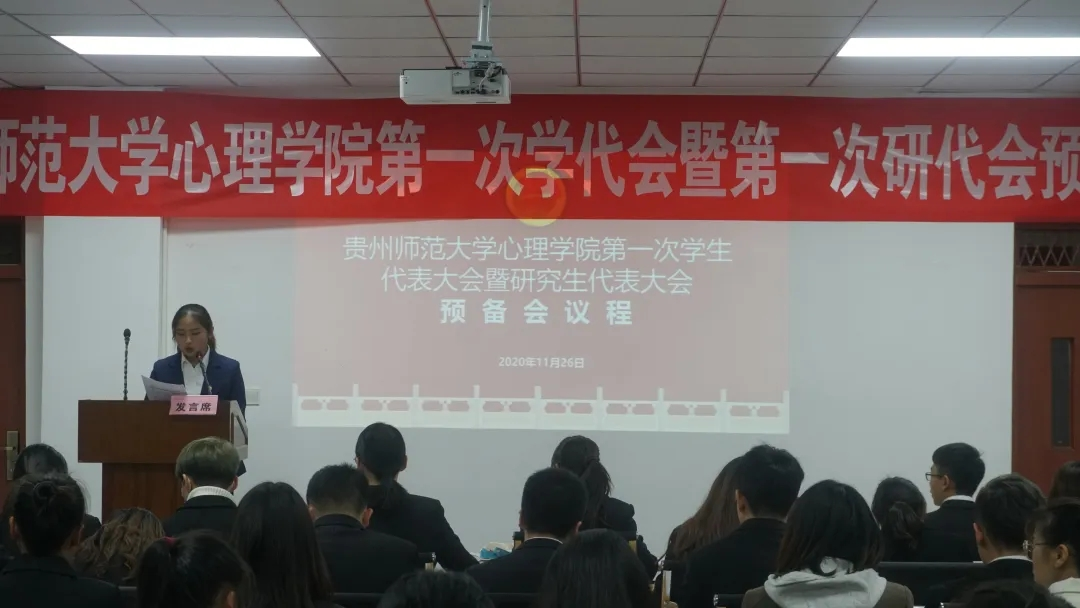 11月26日,心理学院于花溪校区GS5206教室召开第一次学代会暨第一次研代会预备会议。院团委书记高阳、全体正式代表参会。会议由赵可怡主持。