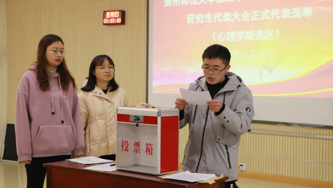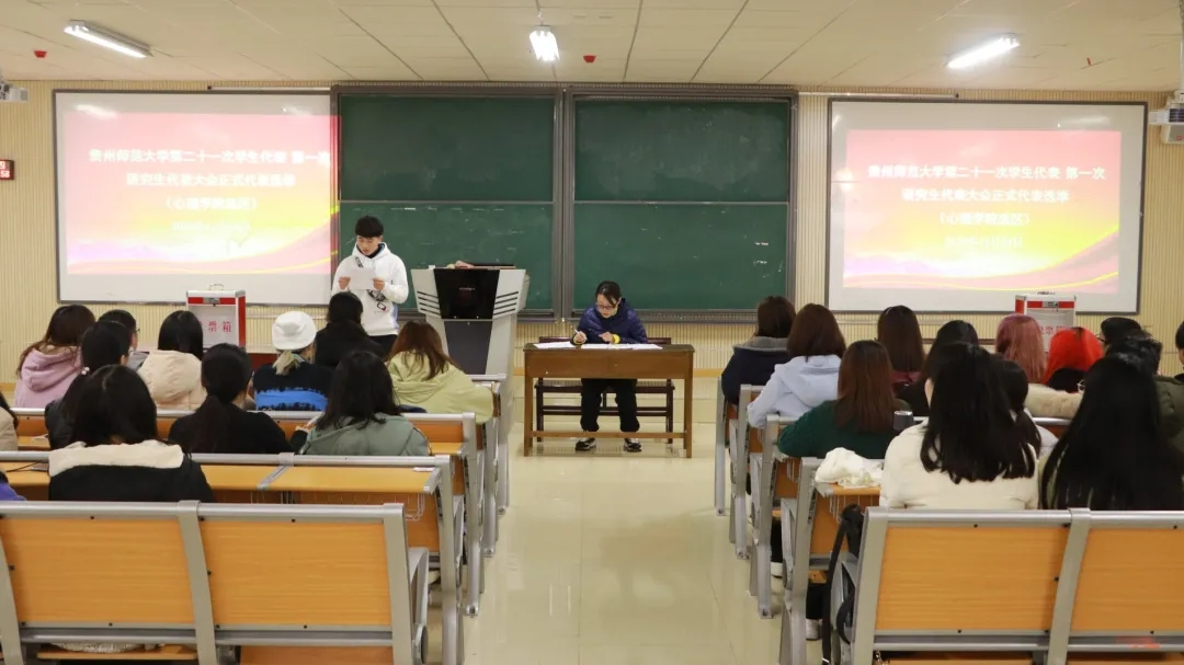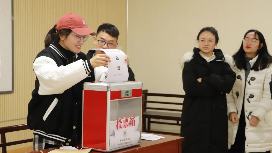 选举会上,工作人员宣读了《贵州师范大学第二十一次学生代表大会代表、贵州师范大学第一次研究生代表大会代表选举办法》并通过了监票人、计票人、候选人名单。大会严格按照选举程序,以无记名投票方式差额选举出了参加贵州师范大学第二十一次学生代表大会和第一次研究生代表大会代表。