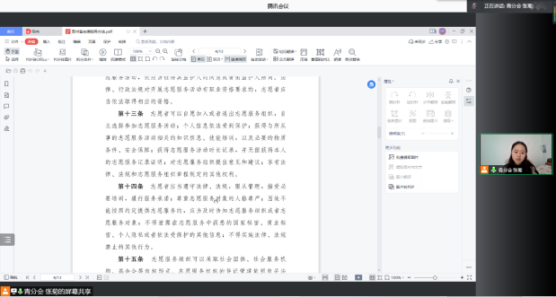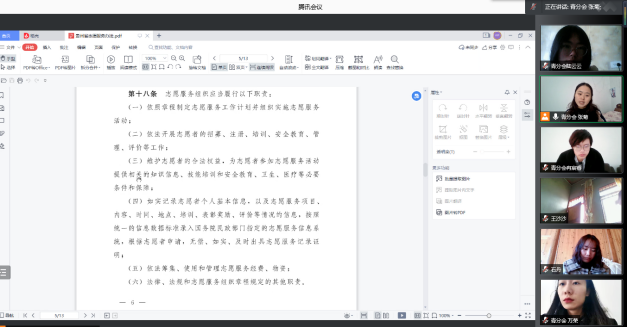 为进一步加强我院志愿者管理,以及确保未来志愿活动项目的顺利开展,我院青年志愿者分于1月19日以线上会议形式组织《贵州省志愿服务办法》专题学习,本次学习由副会长张菊主持,心理学院青分会全体工作人员及各班青年委员参与学习。