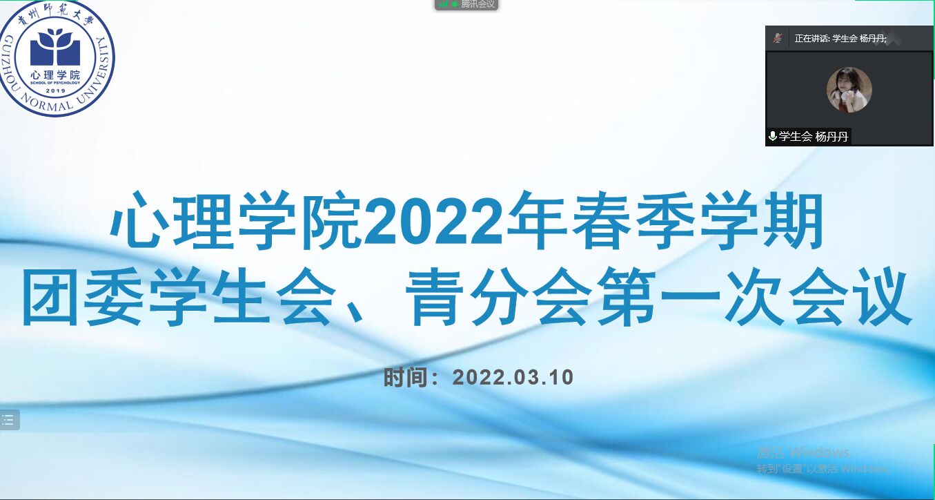 2022年3月10日下午六点,心理学院团学青全体成员于腾讯会议开展2022年度第一次全体会议,本次会议由主席团成员张海东主持,心理学院团学青共计45人参会。 会议内容主要围绕本学期的工作计划和工作细节展开。