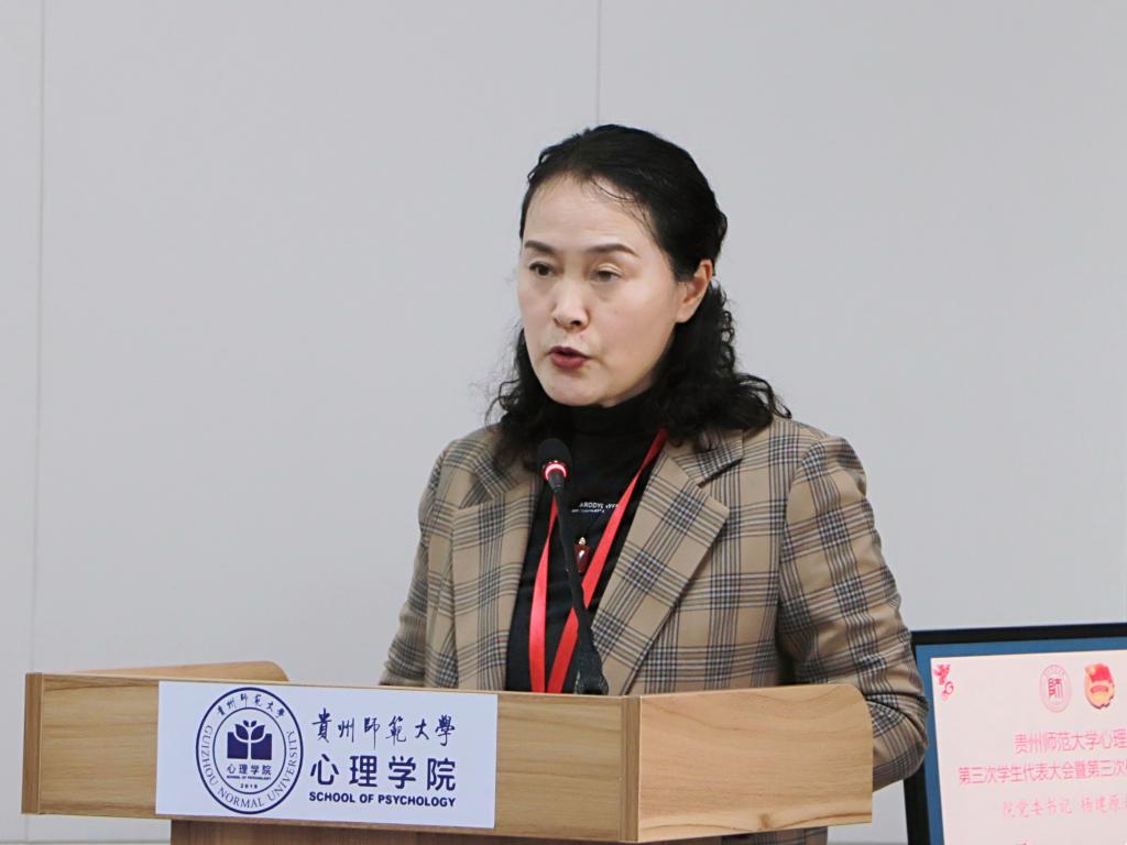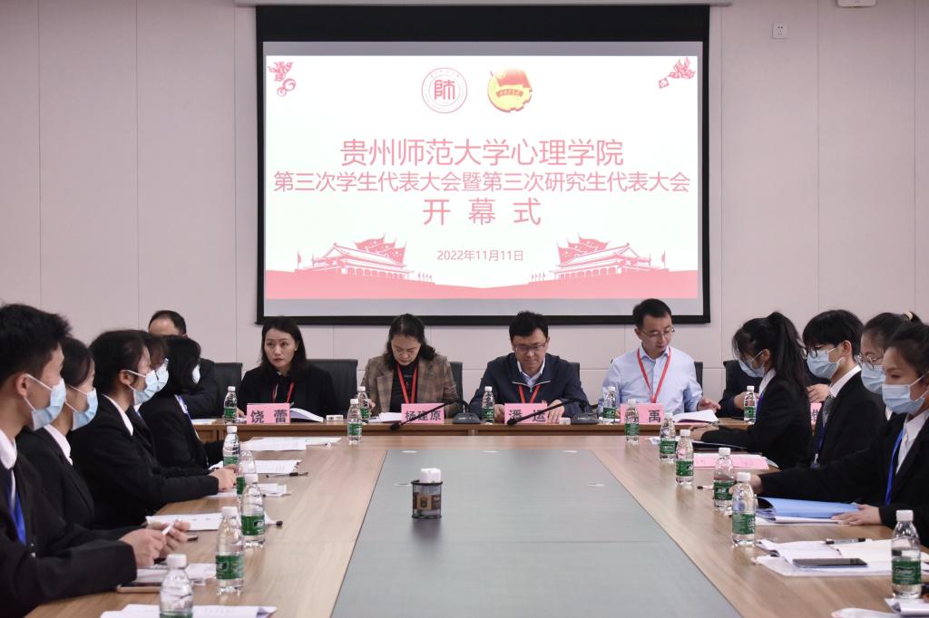 11月11日,心理学院第三次学代会暨第三次研代会于贵州师范大学心理学院脑成像中心三楼会议室召开。心理学院党委书记杨建原,院长潘运,院党委副书记饶蕾,副院长罗禹、陈维,研究生科科长裴子钊,校学生会代表黄骏出席开幕式,我院68名正式代表、列席代表参会。会议由院团委书记高阳主持。大会在庄严的国歌声中隆重开幕。
