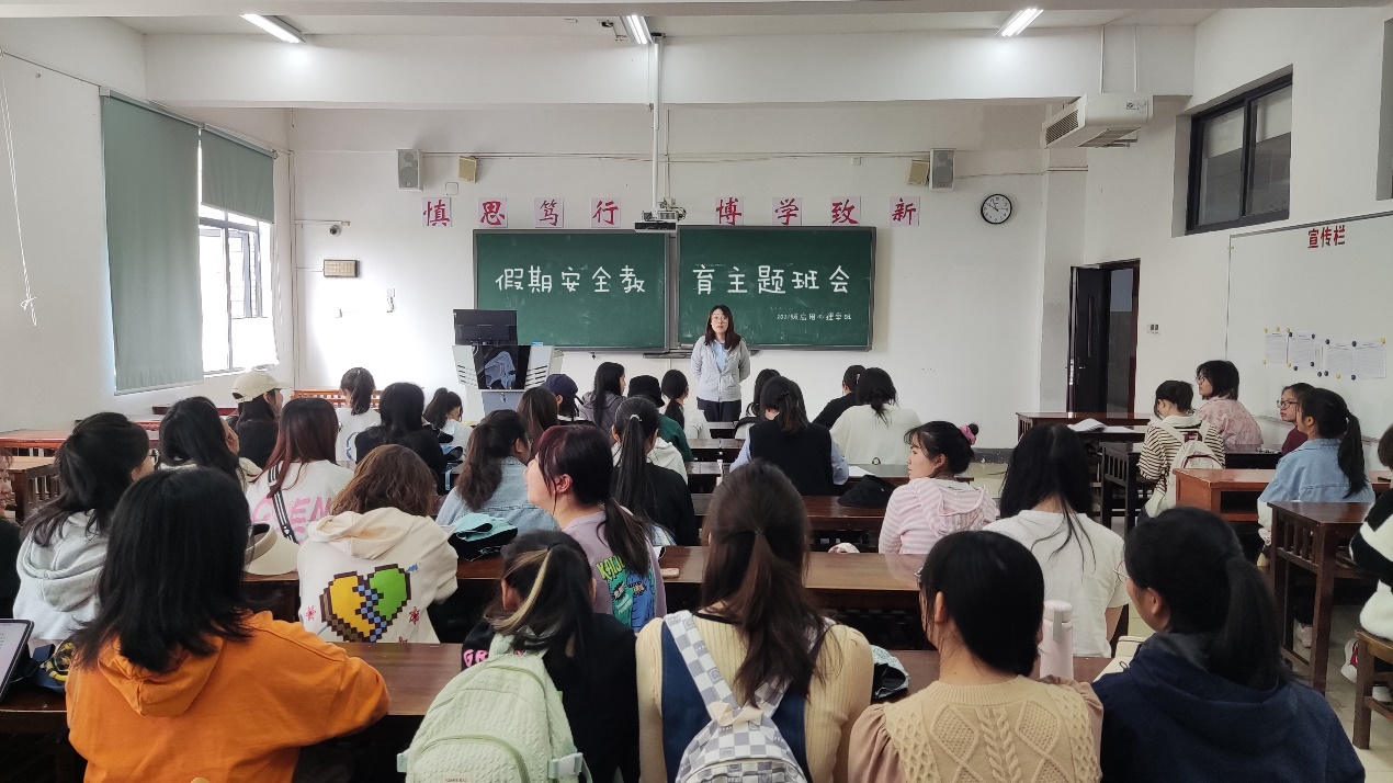各班辅导员以及班委结合本班实际情况,就“五一”假期安全问题传达了学校假期安全教育工作要求,提醒同学们“五一”假期间不要私自下水游泳,要高度警惕汛期安全问题,同时还要防止野外溺水,防范安全事故;一方面,留校的同学要注意用电安全,出门、睡觉前关好门窗和水电,保管好贵重物品,要不断提高自身防火、防盗、防电信诈骗等安全意识;另一方面,离校同学要合理安排出行时间,注意旅途安全,选择安全交通工具,严格遵守交通规则,摒弃交通陋习,做到安全出行;提醒学生们无论是否留校都要注意饮食安全,注意宿舍卫生和个人卫生,养成良好的生活卫生习惯,做好个人防护,预防季节性传染疾病。主题班会上,各班辅导员及班委还强调了同学们要在规定时间内登录学工系统完成“五一”假期离返校登记。