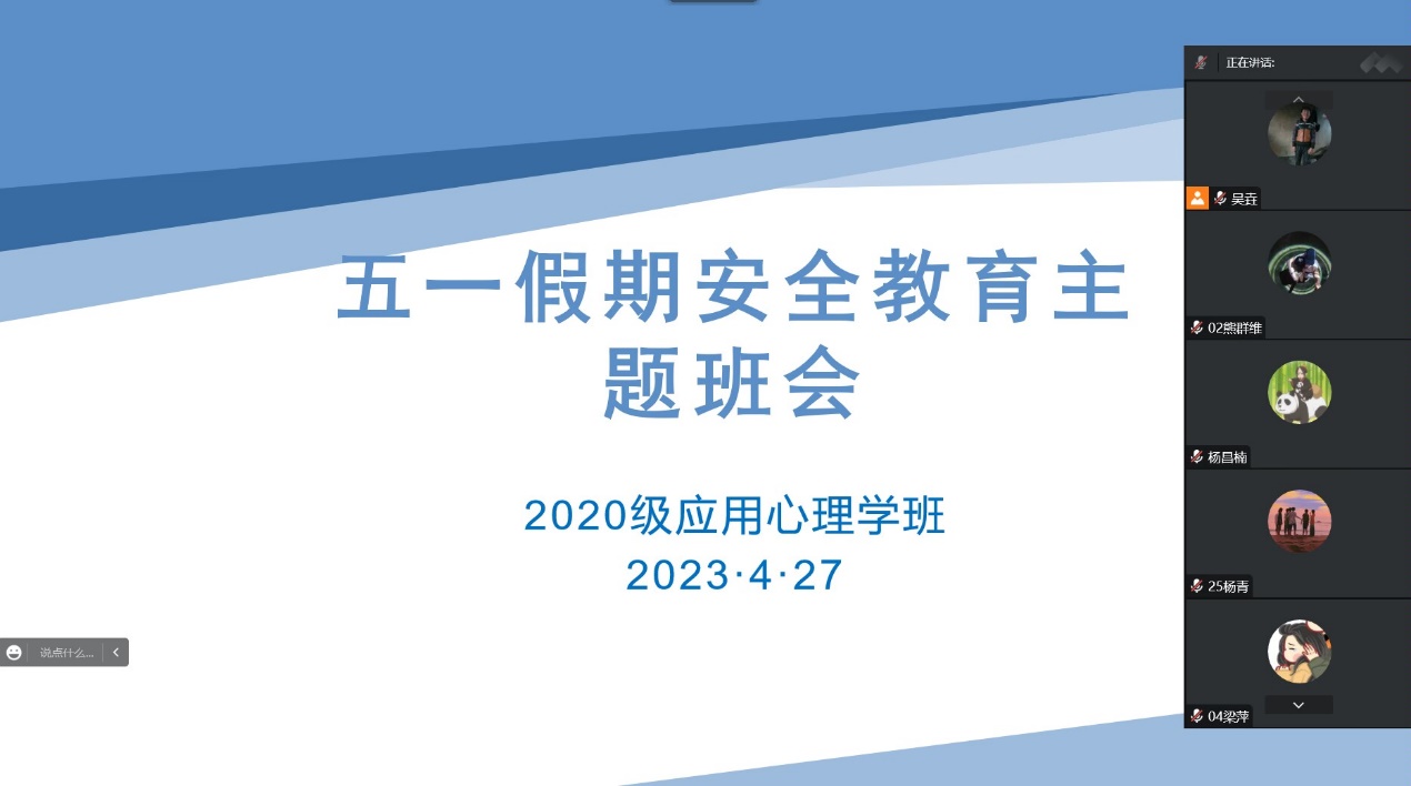 为贯彻落实学校《关于做好“五一”前后学生安全教育管理工作的通知》要求,进一步做好我院学生安全教育管理工作,提高我院学生的安全意识,4月27日至4月28日,心理学院积极组织本科生各班开展了“五一假期学生安全教育”主题班会。
