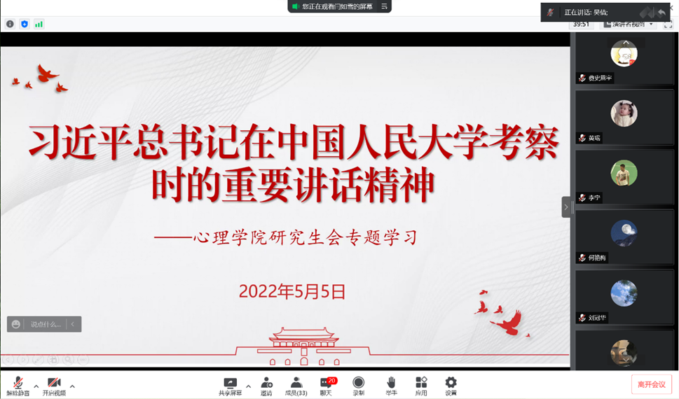 5月5日,心理学院研究生会采用线上会议的方式,学习习近平总书记在中国人民大学考察时的重要讲话精神,会议由院研究生会主席团成员闫如雪主持,研究生会全体成员参加了会议。