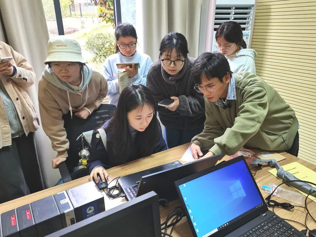 线上培训结束后,同学们来到脑成像中心208-1多导实验室,由在读博士研究生念靖晴和谭江详细介绍了学院多导生理仪的使用注意事项,通过实物实际操作,向大家直观展示设备具体使用流程,并且指导同学们从硬件连接到软件操作完成了一整套操作流程。培训结束后,赵庆飞老师和孙宇老师组织卷面笔试考核以及上机操作考核。