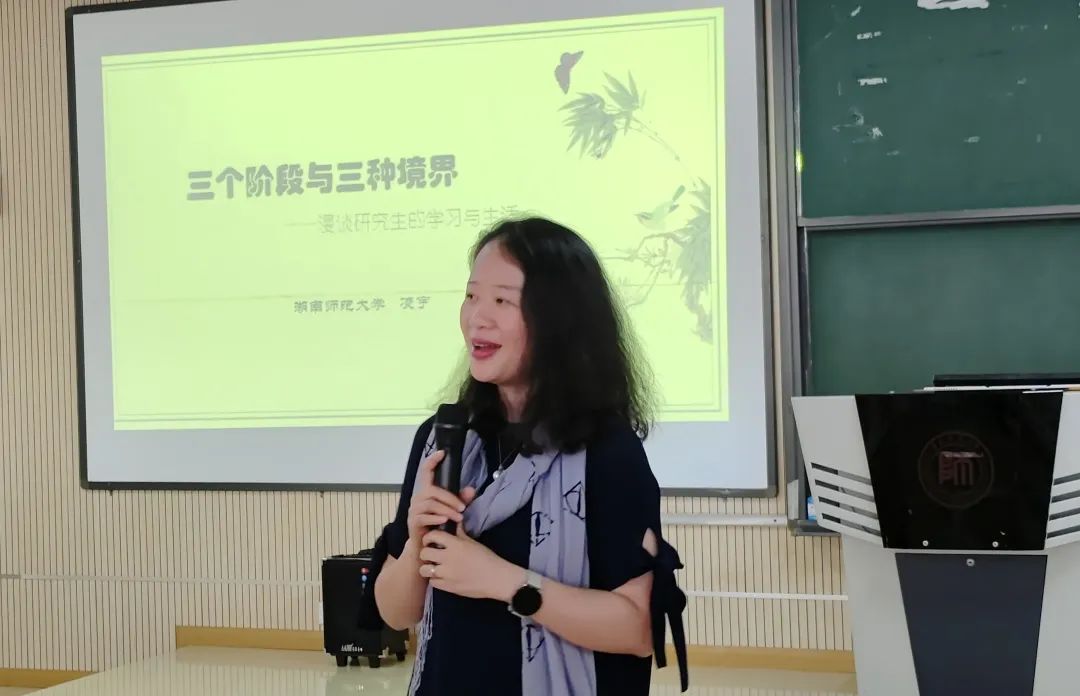 论坛上,湖南师范大学凌宇教授作了题为“三个阶段与三种境界——漫谈研究生的学习与生活”的报告。她从三个阶段展开论述研究生应该怎样学习、生活。首先是探索阶段,她指出研究生要正确对待自身拥有与存在的关系,注重内在的学习与成长,关注目标的掌握及终身成长。其次是执着阶段,拥有灵活的思维与开放的心态是非常重要的,要有接纳多方面事物与知识的能力,除此之外,还应培养自主学习的能力,保持终身学习。最后,在领悟阶段,她指出探索实现自我同一性的重要性,在学习与生活中要经常自我反思,寻求人生更多的可能性。