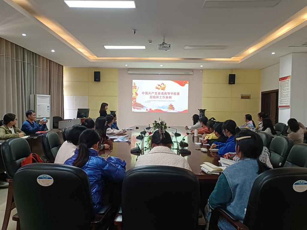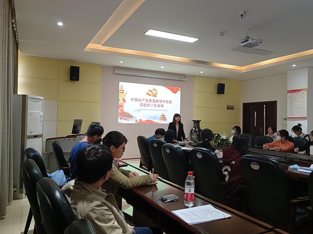 《中国共产党普通高等学校基层组织工作条例》内容包含总则、组织设置、主要职责等共十章。黄华宇结合学院党建工作实际情况对条例中的内容逐条进行解释说明,要求党支部书记和党务工作者要认真学习领悟条例内容,并在平时工作中遵照执行。