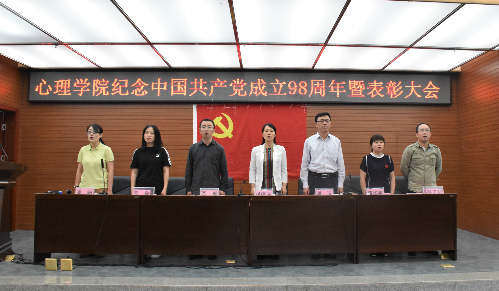 大会在庄严的国歌声中拉开序幕。潘运宣读了新成立的7个党支部支部选举结果、心理学院新党员名单,并组织新党员举行入党宣誓,老党员重温入党誓词,团员观礼。
