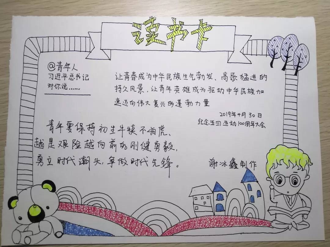支部成员在自主学习习总书记在纪念五四运动100周年大会上的讲话后,根据个人学习情况,摘抄使自己深受启发的语段,并结合师范生专业技能,将其呈现在自己精心设计的读书卡上,并在支部内进行传阅,同时分享学习心得。