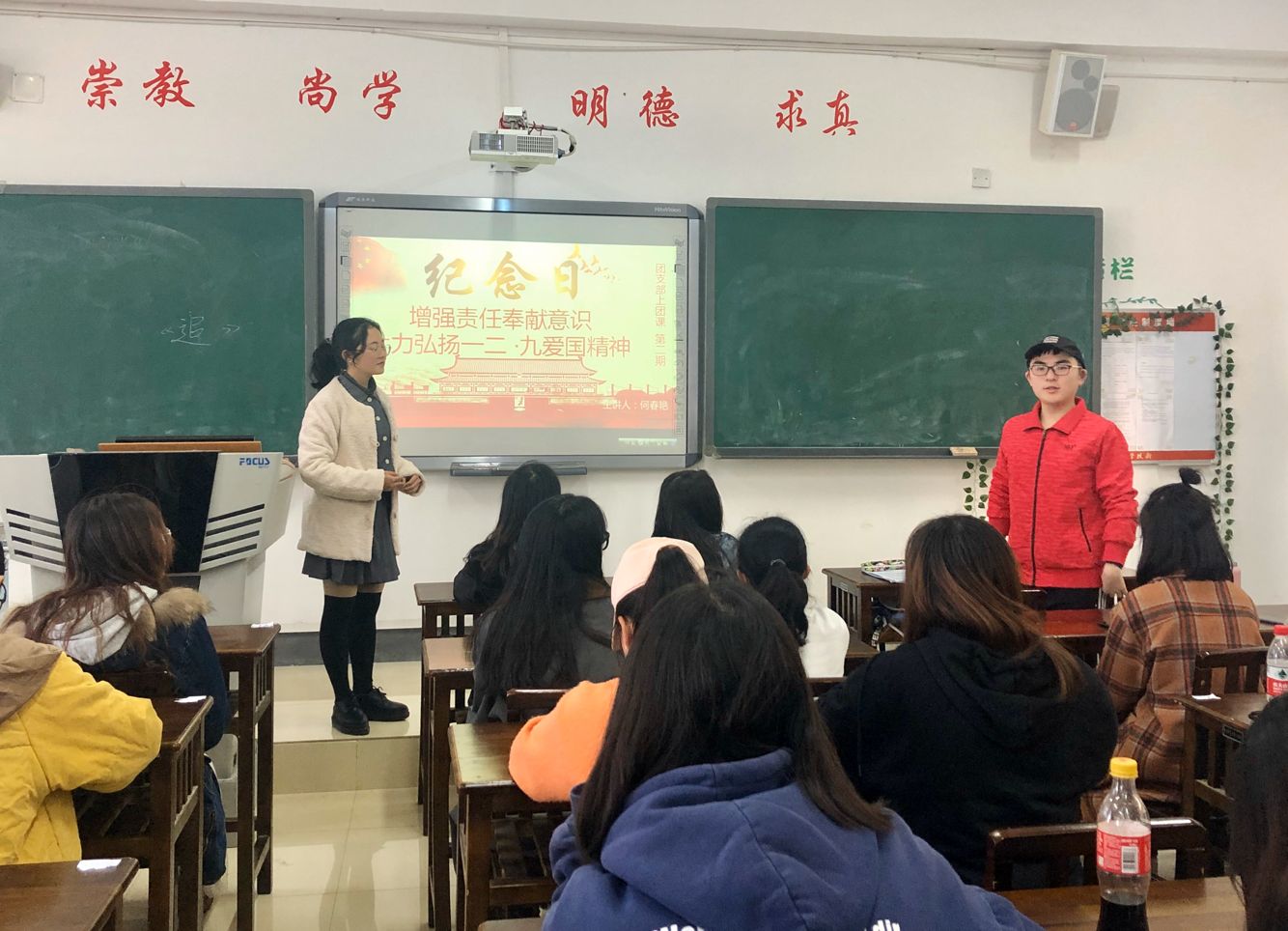 19级团课通过三个活动展开,在“青春,我为祖国而奋斗”活动中,万力玮和谢博宇两位同学朗诵了《时代在召唤》,将其对祖国的热爱、对民族之难的缅怀以及对救国青年的悼念等情感融于朗诵中,展现了新一代大学生的精神风貌,更激发了班级团支部成员们的爱国情感;“践行核心价值观,争做最美代言人”活动,以回顾红色经典歌曲,感受伟大爱国情怀,唤起红色记忆,追寻红色足迹,学习革命先烈精神,传承红色基因,唱响“爱国·爱党”的主旋律;“爱校荣校,薪传使命”活动中,通过播放“12·9运动”纪录片,激发同学投身社会、报效祖国的爱国主义情怀。