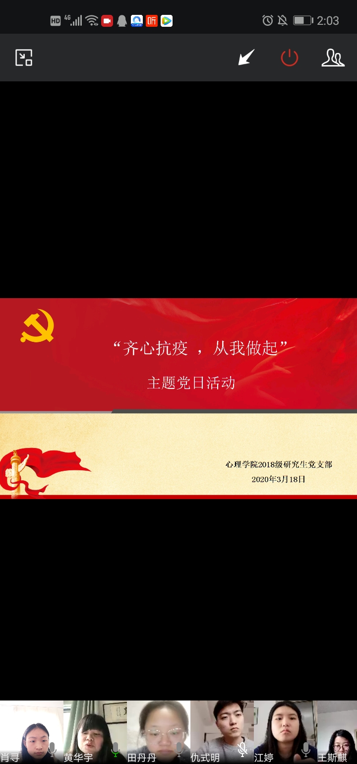 为了进一步贯彻落实习近平总书记对新冠肺炎疫情防控工作的重要指示精神,落实学校和学院党委的决策部署,在特殊时期充分发挥好党支部的战斗堡垒作用,提高学生党员的责任意识、疫情防控意识,激励学生党员在疫情防控阻击战中发挥先锋模范作用,心理学院2018级研究生党支部于3月18日通过“企业微信”平台视频会议的方式开展了“齐心抗疫、从我做起”主题党日活动。