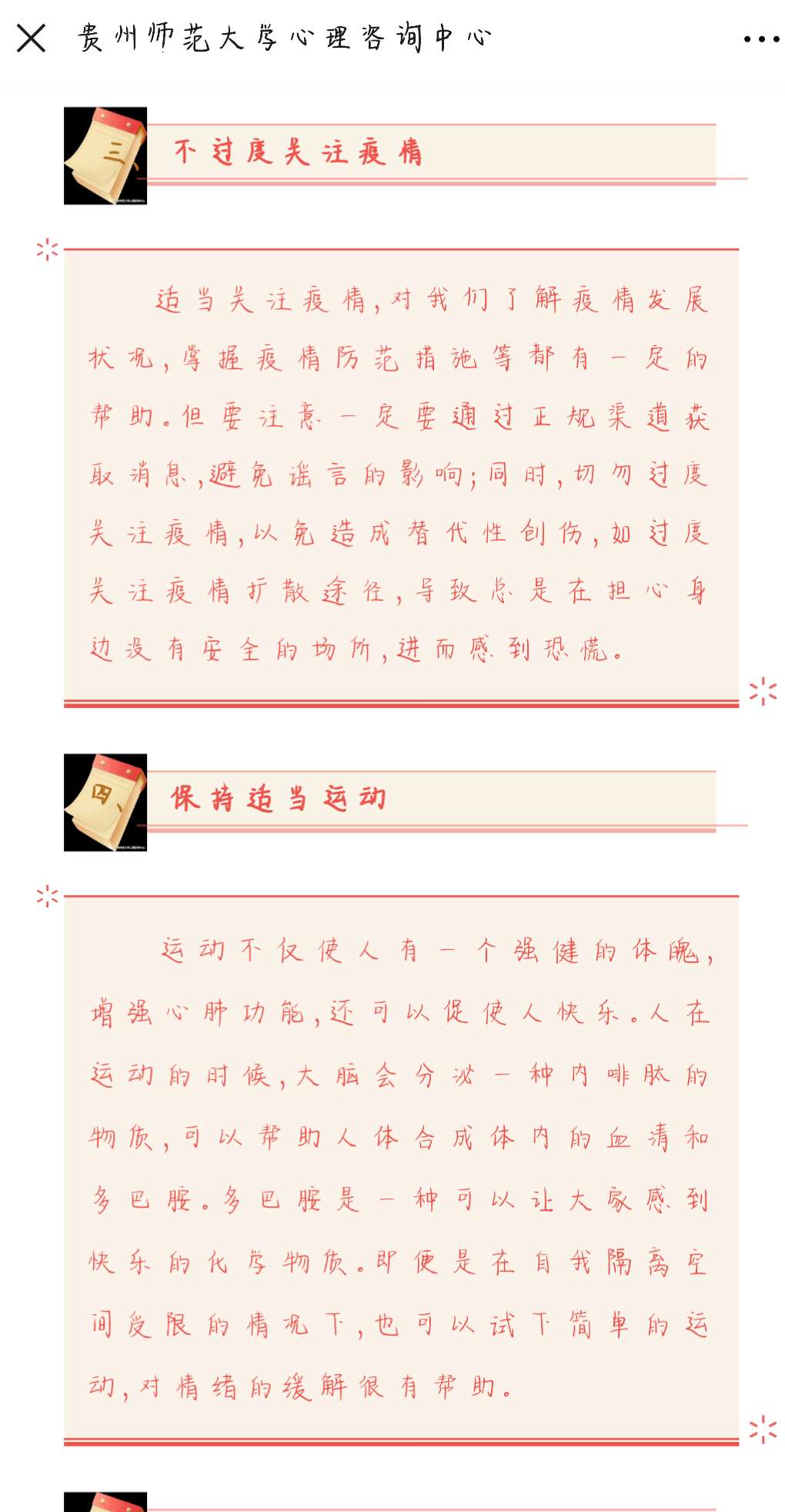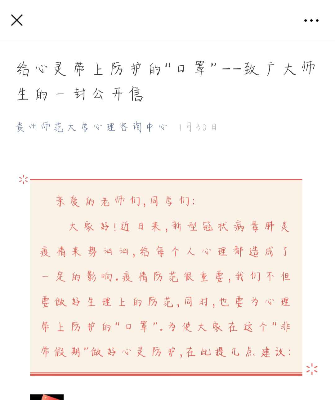 “亲爱的老师们、同学们:大家好!近日来,新型冠状病毒肺炎疫情来势汹汹,给每个人心理都造成了一定影响。疫情防范很重要,我们不但要做好生理上的防范,同时,也要为心理戴上防护的‘口罩’……”这是1月30日,“贵州师范大学心理咨询中心”微信公众号上发布的《给心灵戴上防护的“口罩” ——致广大师生的一封公开信》一文。该篇文章在短时间内迅速获得了5000余次的阅读量,引发师生们的热议。