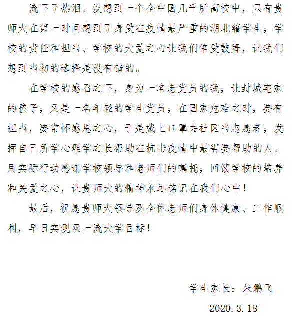 2月19日,贵州师范大学给146位在鄂学生寄去了慰问信和口罩,这一善举感动着每位师生家长。同时我院家住湖北利川的19级研究生党员朱璐瑶随后收到了这暖心的问候,展信读信之时,全家人为此深深打动,其父亲给学校写来了一封感谢信!