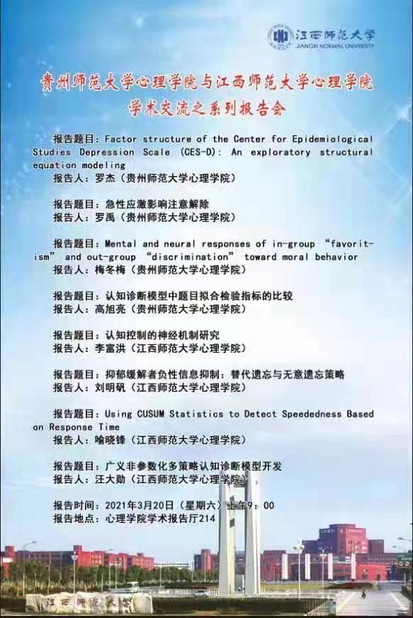 随后,与会人员参加了贵州师范大学心理学院与江西师范大学心理学院学术交流之系列报告会,我院罗禹、罗杰、梅冬梅、高旭亮等四位老师以及江西师大心理学院李富洪、刘明矾、喻晓峰、汪大勋等四位老师分别在报告会上作了精彩的学术报告。