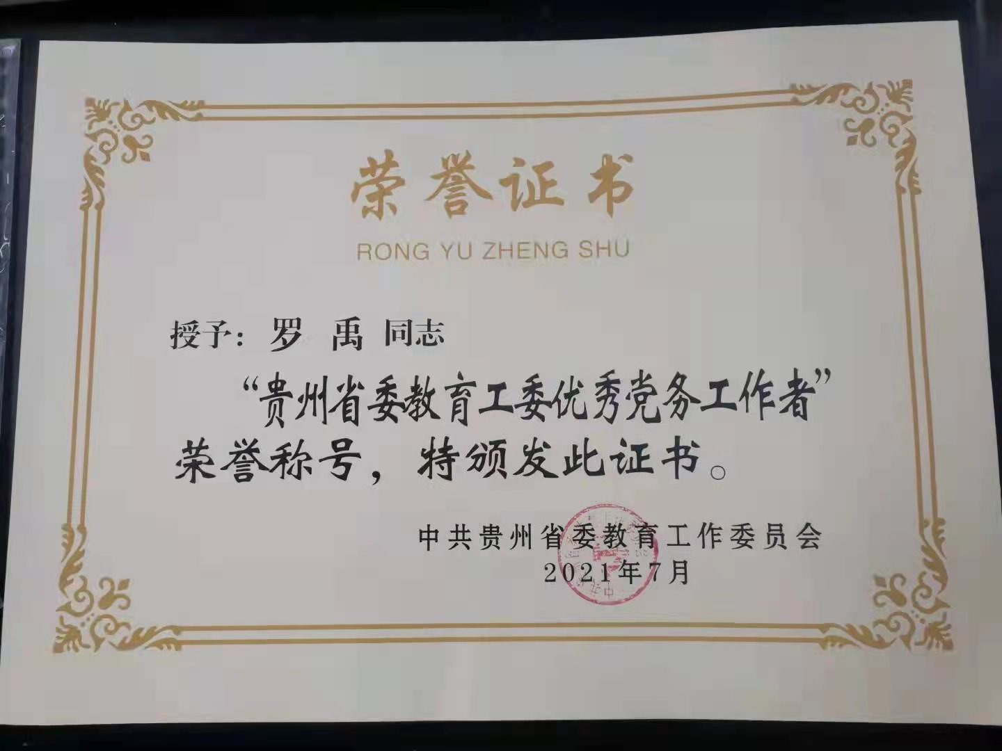 热烈祝贺我院罗禹老师获“贵州省委教育工委优秀党务工作者”荣誉称号。