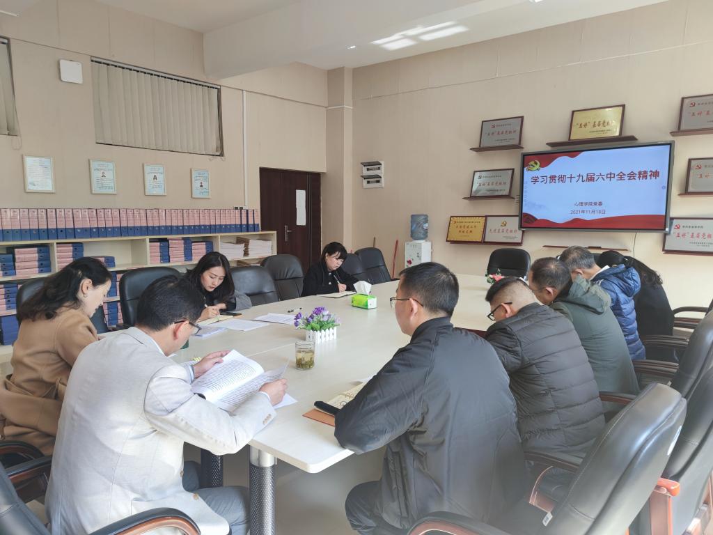 11月18日,心理学院在学院三楼党员活动室召开党委理论学习中心组(扩大)会议,专题学习党的十九届六中全会精神和第27次全国高校党的建设工作会议精神,传达学习贵州省委对十九届六中全会学习的要求。党委班子潘运、饶蕾、罗禹、黄华宇,副院长陈维、科室负责人、党支部书记参加,无党派教师代表、院学科建设办主任曾练平列席。院党委书记杨建原主持。