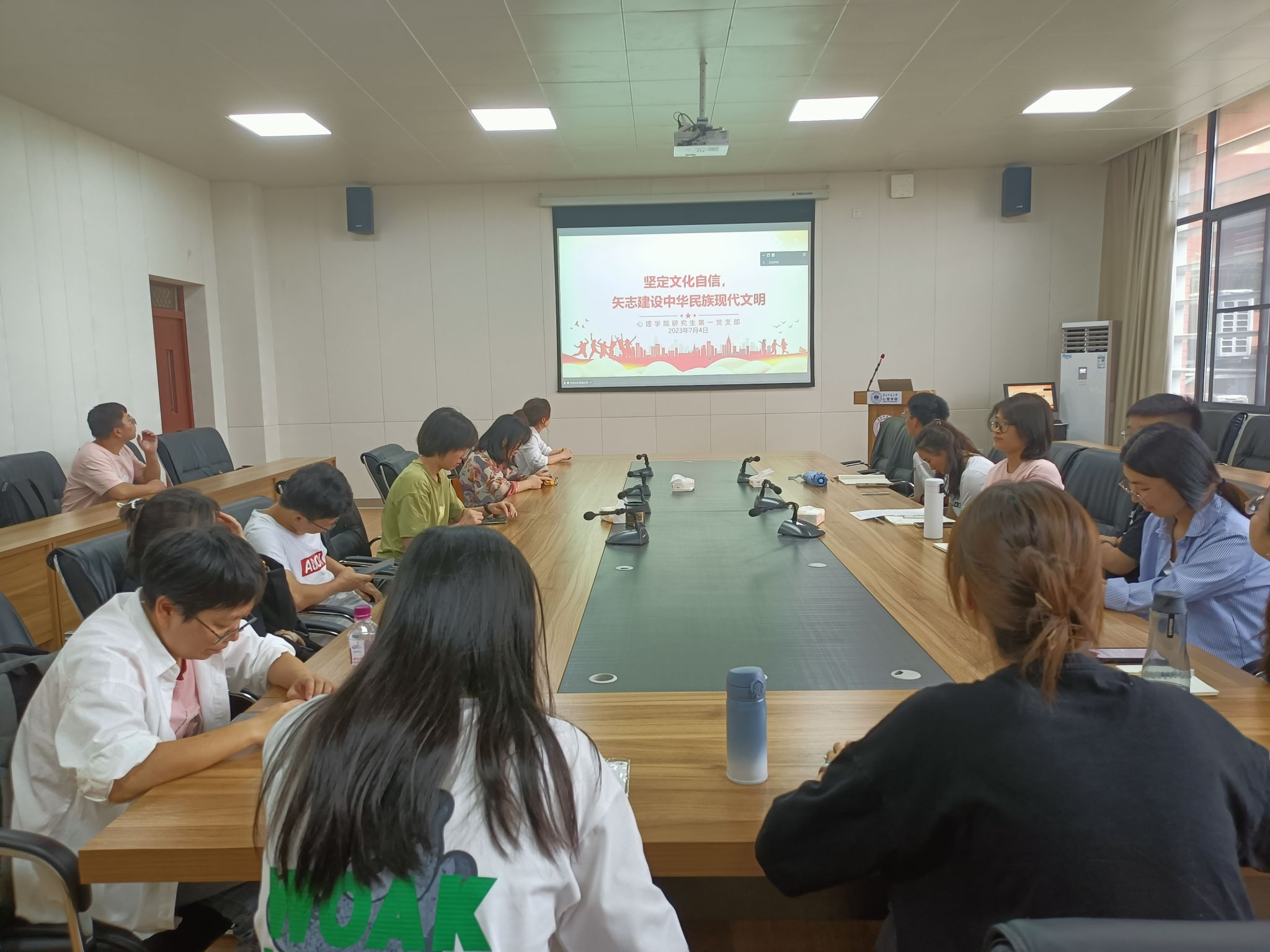 为深入开展学习贯彻习近平新时代中国特色社会主义思想主题教育,切实增强开展主题教育的思想自觉、政治自觉、行动自觉,推进主题教育走深走实。7月4日,心理学院研究生第一党支部开展了主题为“坚定文化自信 矢志建设中华民族现代文明”党日活动。