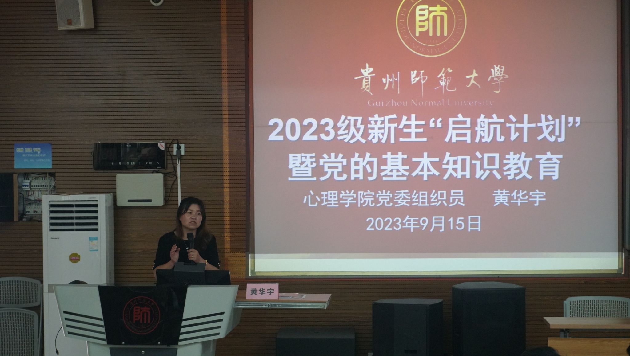 为深入开展党的基本知识教育,切实加强大学生思想政治教育,鼓励学生积极向党组织靠拢,9月15日下午,心理学院在学校公教6202教室开展2023级新生“启航计划”暨党的基本知识教育。心理学院党委组织员黄华宇担任本次讲座的主讲,全体2023级新生参加。
