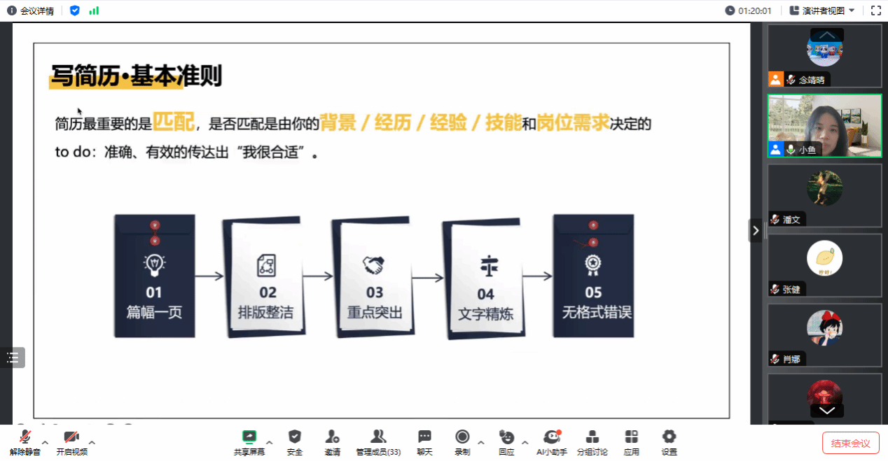 讲座围绕职业选择、简历制作和实例剖析与修改三个方面讲解如何制作出适配职位需求的高质求职简历。在职业选择方面,通过薪资、生活质量、职业理想等方面阐述找工作和找生活的关系,为同学们第一份职业的选择提出了切实的建议。如:优先选择适合自己的稀缺性等。在简历制作方面,从职位需求、制作简历的基本准则、布局和内容要求等方面讲解如何制作出一份与岗位需求匹配的优质简历,并提醒同学们在制作简历时不要出现格式错误等细节问题。在实例剖析与修改环节,通过对参加培训同学提交的简历进行剖析,通过对标优质简历,引导同学们发现自己提交简历中存在的问题与不足,并针对简历中存在的问题与不足给出了详实的修改建议。