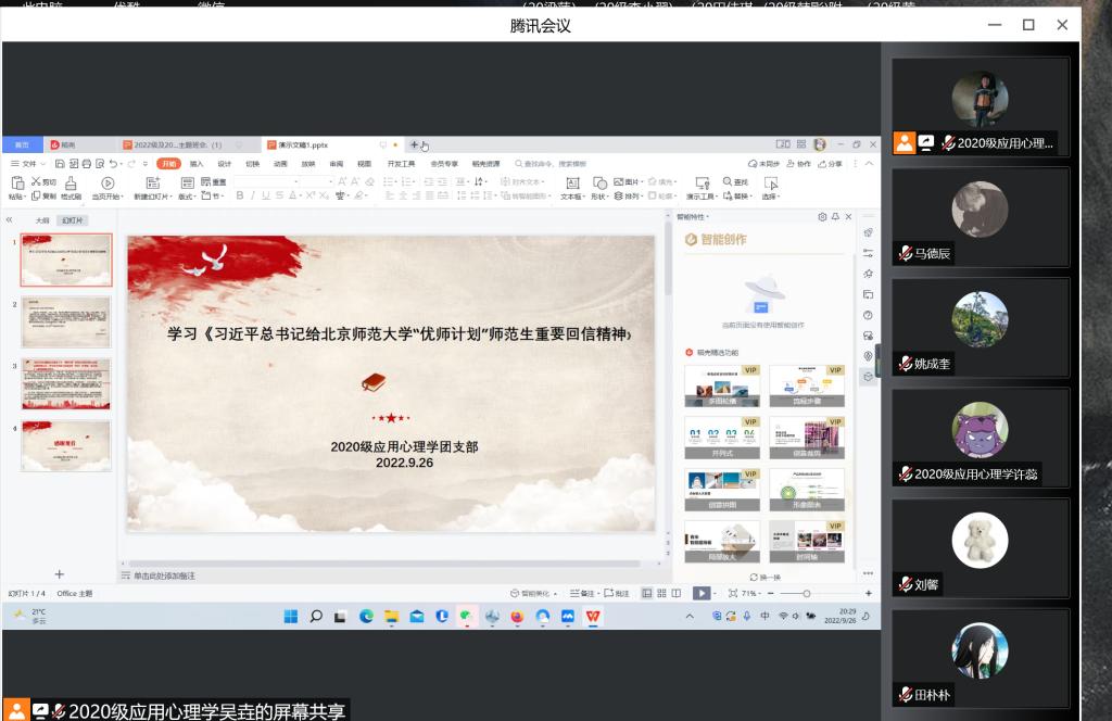 为深入学习贯彻习近平总书记给北京师范大学“优师计划”师范生重要回信精神,喜迎党的二十大召开,9月26日—30日,心理学院团委组织各团支部、全体团员青年,结合自身实际,通过线上集中学习、分散自学等形式对习近平总书记的回信进行了学习探讨,各支部成员踊跃发表各自学习的体会和心得,纷纷表示将不负习近平总书记的嘱托,不断砥砺品格,增长传道授业解惑本领,努力成为党和人民满意的“四有”好老师,为培养德智体美劳全面发展的社会主义建设者和接班人贡献力量。