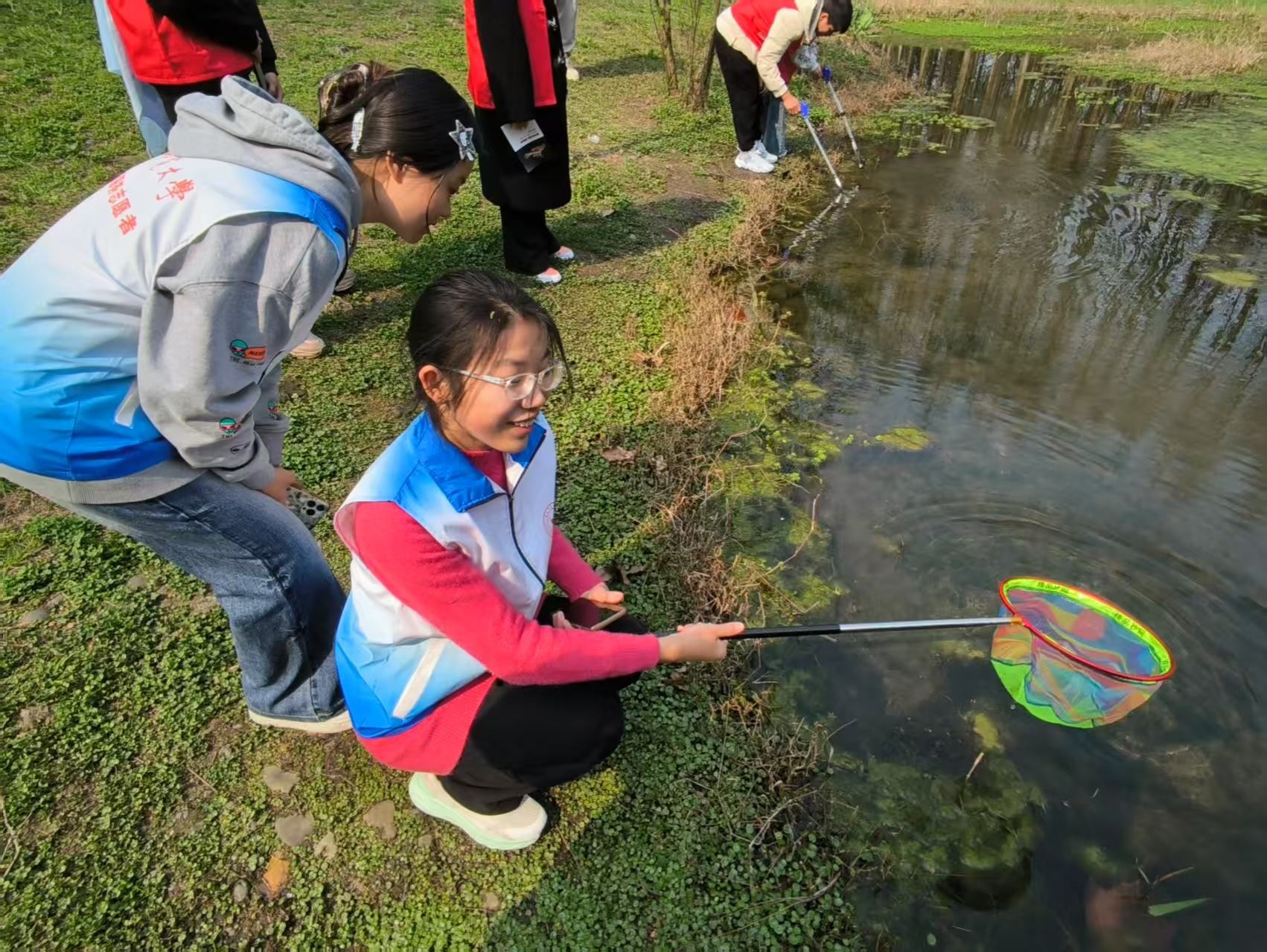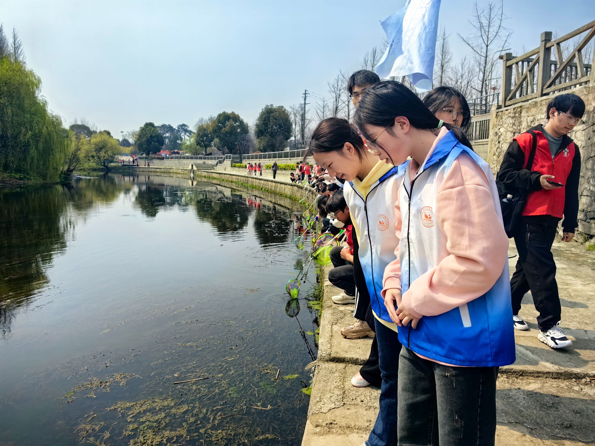 活动伊始,科普馆工作人员为志愿者们大致讲解活动内容,还邀请了“全国十大江河卫士”雷月琴老师为志愿者们讲述自己与生态环境保护的志愿故事,希望同学们在学雷锋活动中不断锤炼自身品质,成为有爱心、有责任、有担当的新时代青年。活动过程中,在工作人员的带领下,志愿者们沿着河道一路前行,在十里河滩部分路段进行了河道的垃圾清理和入侵生物福寿螺的打捞,清理垃圾约5公斤,包括塑料品,包装袋等各类淤积河道杂物,同时打捞清理入侵生物如牛蛙蝌蚪、福寿螺等。