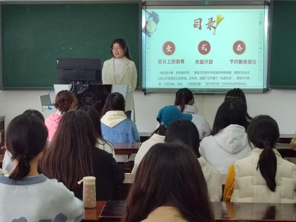 为弘扬中华民族勤俭节约的传统美德,践行社会主义核心价值观,提高团员思想理论水平和政治素质,2022年11月24日,心理学院2022-2023学年团校培训班于学院楼2207开展了题为《节约粮食,从现在做起》的主题团课,由2020级应用心理学班团支部书记黄莲担任主讲,团校培训班全体成员参与。