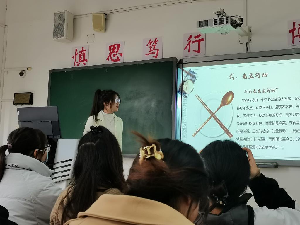 团课伊始,黄莲通过粮食浪费的具体数据、粮食浪费最严重的区域,强调了粮食浪费现象的严重性,提醒学员们重视粮食浪费问题。接着,为学员们介绍了我国光盘行动的宗旨,倡导厉行节约反对铺张浪费,鼓励学员们积极参与学校组织的光盘行动和遵守中华民族的传统美德,珍惜粮食节约粮食。团课最后,黄莲为学员们更好地践行节约粮食,提出了建议,一是吃多少、点多少、打多少;二是养成打包的习惯;三是敢于制止浪费现象,减少浪费现象;四是提倡饮食均衡,不偏食不挑食。养成生活中珍惜粮食、厉行节约、反对浪费的良好习惯。