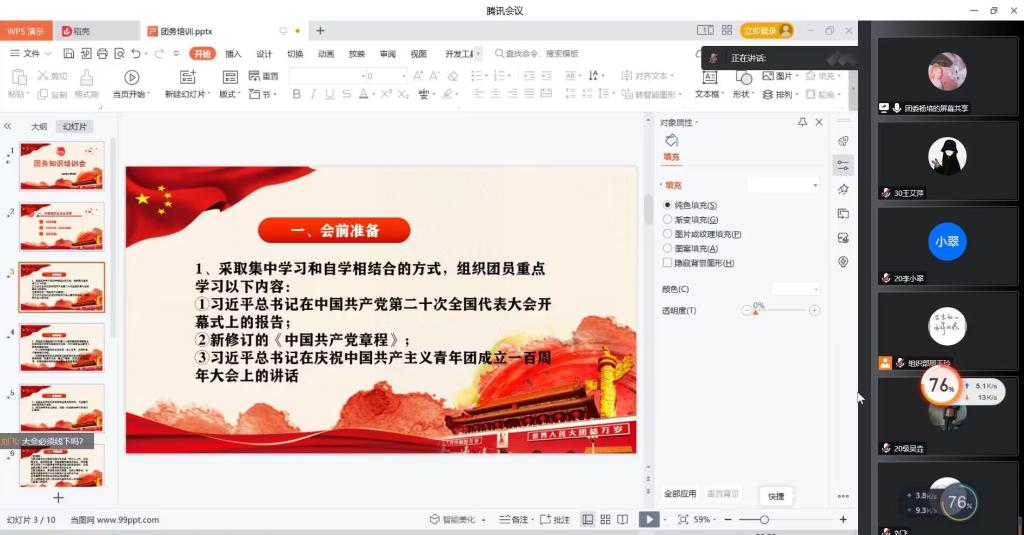 2022年11月29日晚,心理学院团委于腾讯会议组织召开2022年团务知识培训会。本次培训由院团委副书记杨培担任主讲,院团委组织部全体成员、各团支部委员共20余人参会。