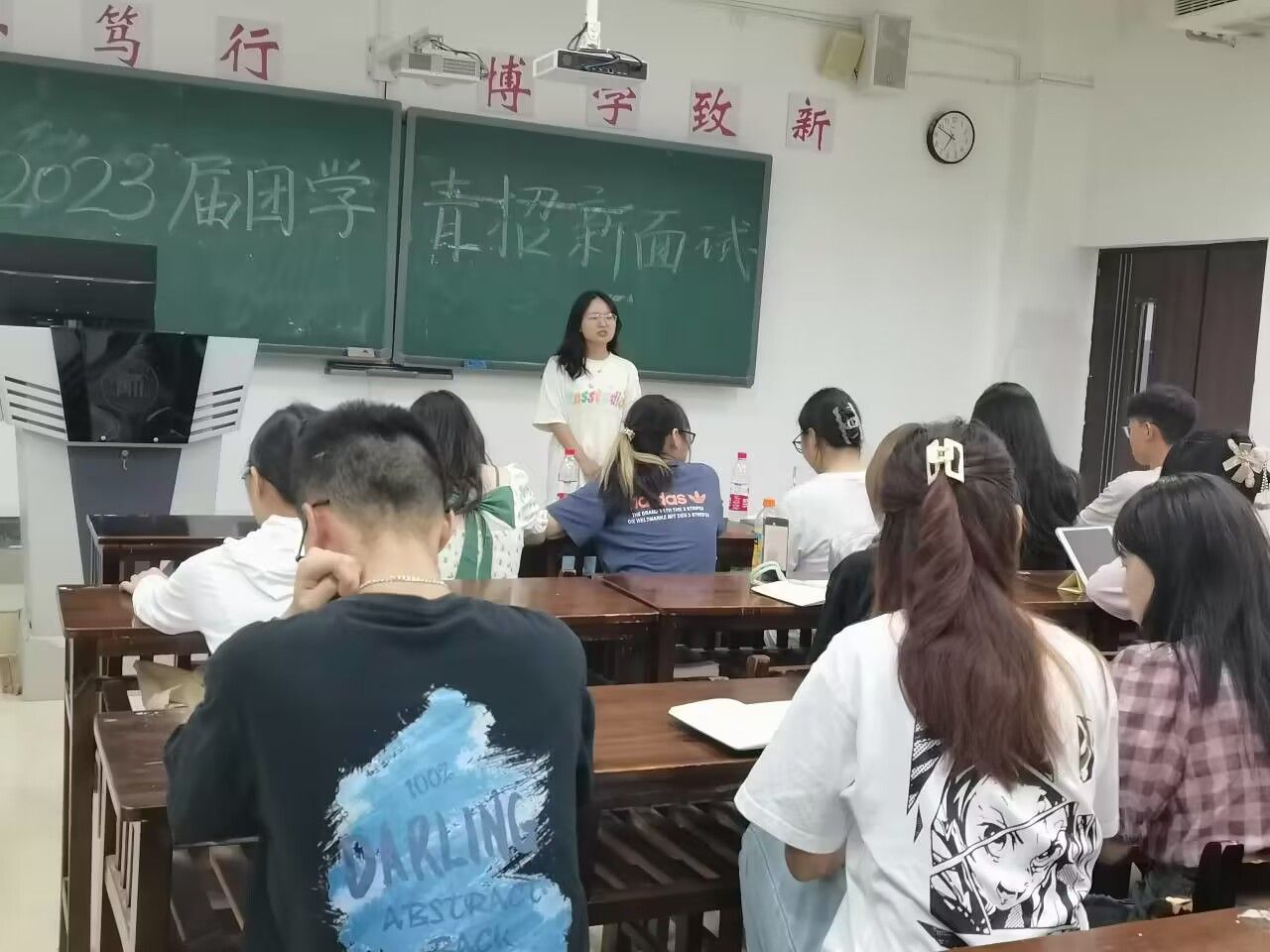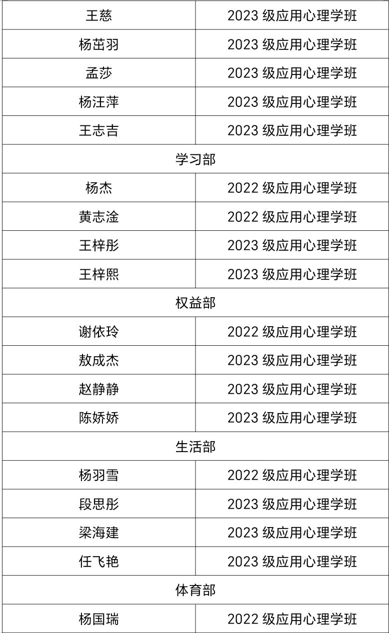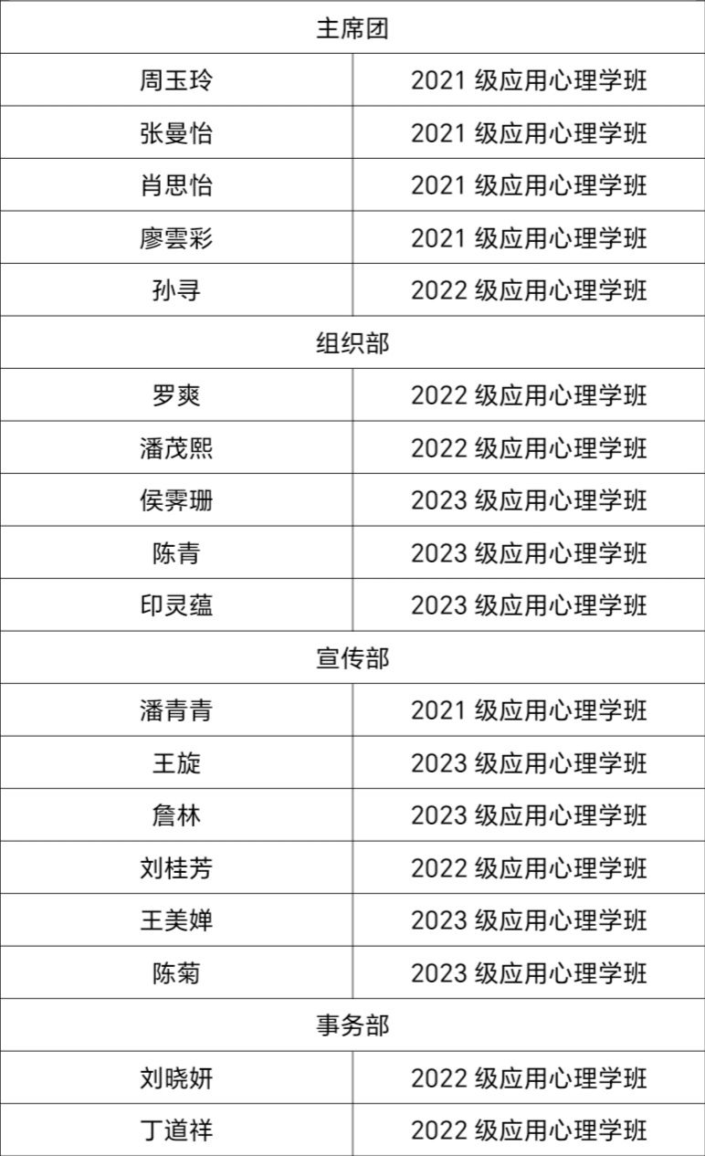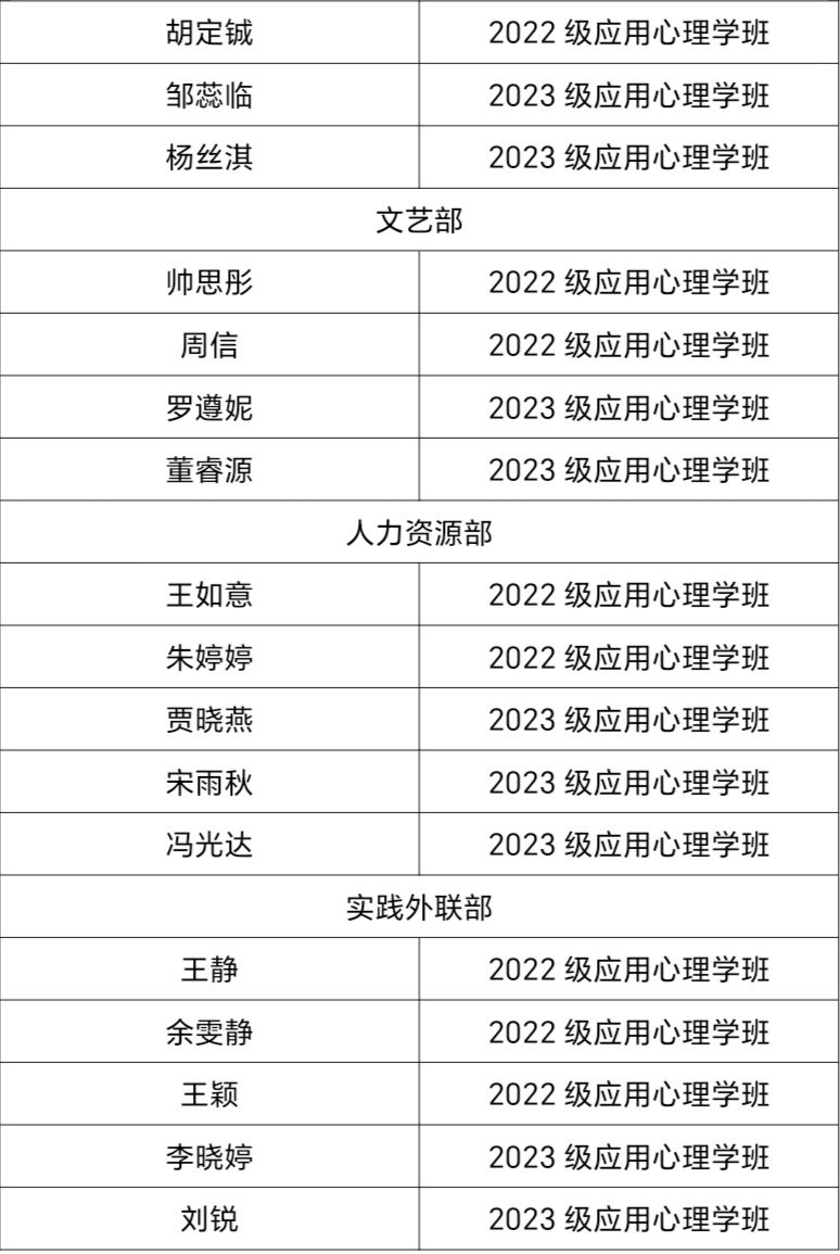为进一步促进我院学生工作,充实学生干部队伍,更好地开展活动、服务同学,也向本科学生提供一个展现自我、挑战自我、超越自我的平台。心理学院团委于2023年9月1日——9月18日开展招新工作,通过自主报名、团支部审核推荐、面试三个环节进行。面试于学院楼2207教室进行,团学青主席团成员及各部门负责人担任面试官。